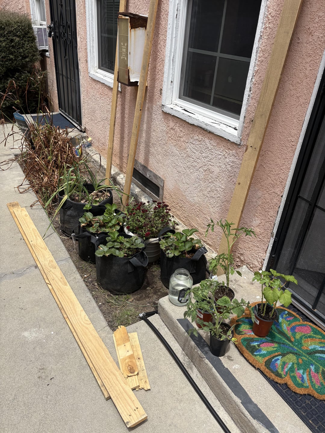 Definitely some zone 9/10 privilege going on here but I think I might not be too late! Put in a couple more tomatoes, cucumbers, and okra as well as some additional herbs in my flower pots. Tomorrow I’ll add crossbeams to the loose beam of the trellis and run galvanized wire at intervals for climbing.