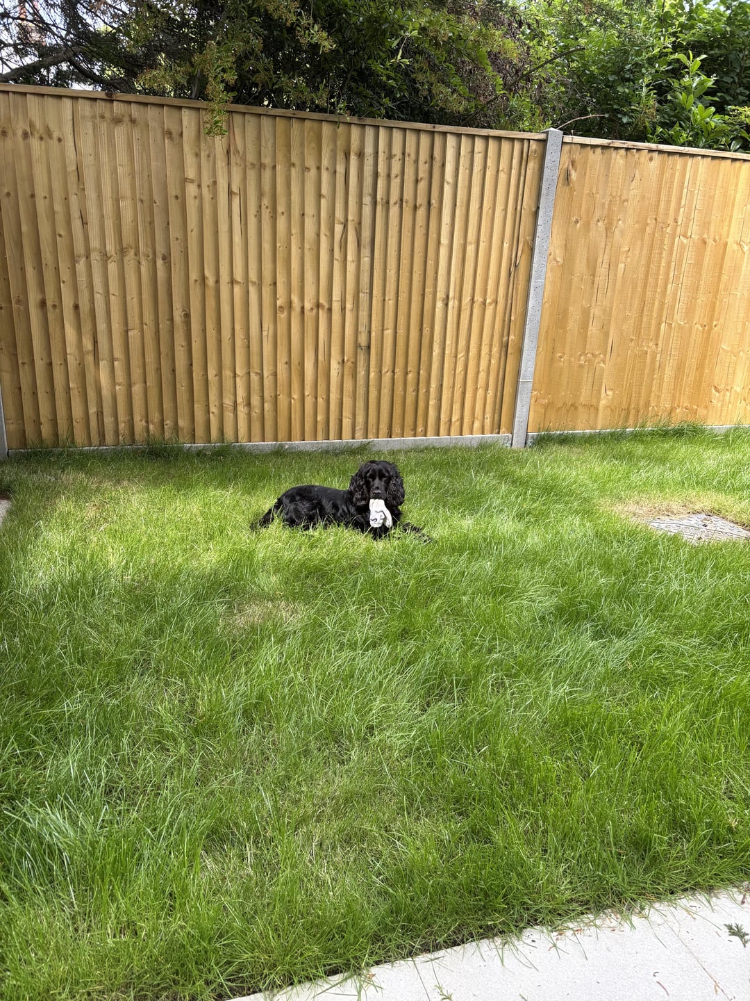 Photos of my mums dog with her sock on it a few days ago and this morning after mowing it last night