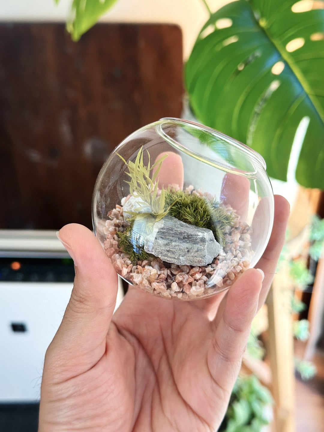 I used to make tiny terrariums like this. They don’t really need watering, but you might put a couple drops of water on the foliage if it’s looking thirsty.