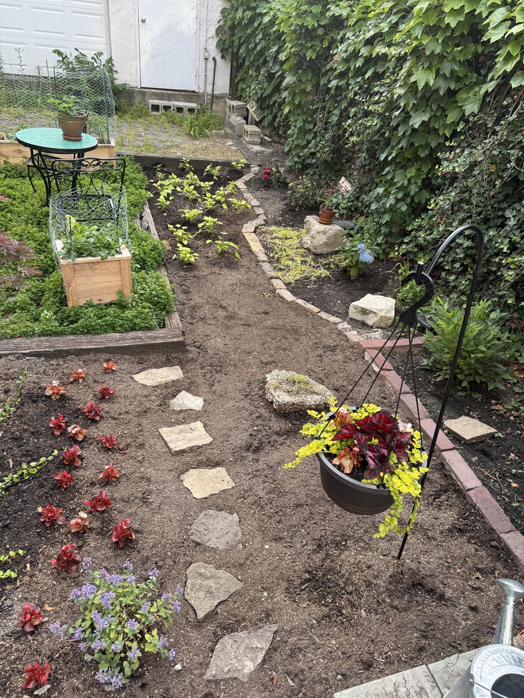 Some of these perennials were split from neighbors’ plants (and stuff that came from my Buy Nothing group), which helped keep the cost down some. Quite a bit of the decor, including the fountain (I think it’s just a cheapo Wayfair fountain, but still), came from yard sales.