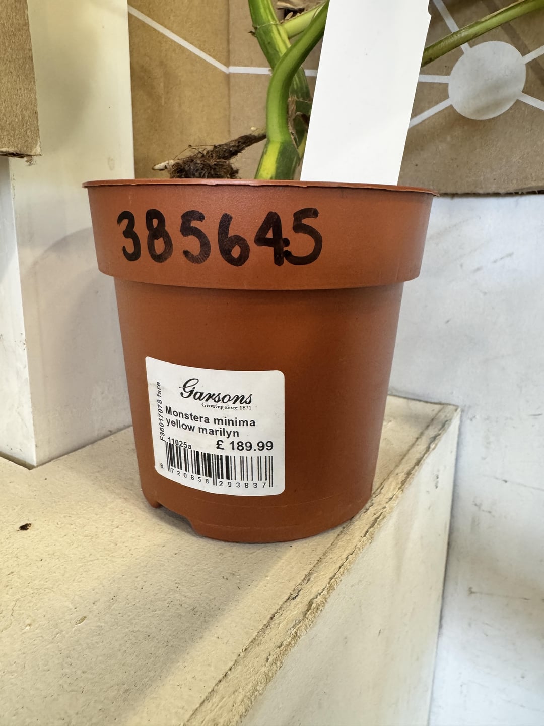 Well first thing is they have the name completely wrong on that label. It’s not a Minima. I’d bet, based on the size of those leaves, the price, and the way they’ve cut the browning bits back, that it’s a Monstera deliciosa “yellow Marylin”