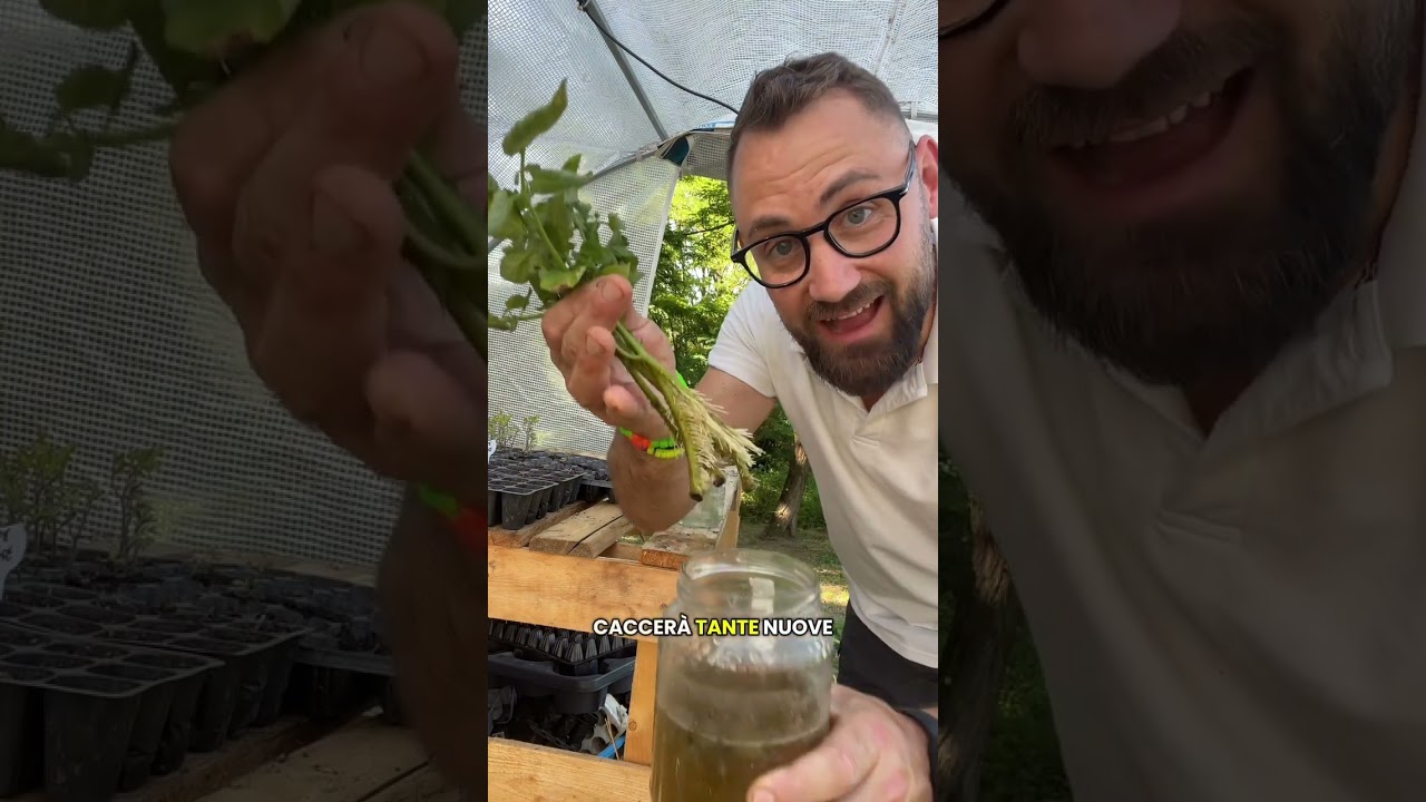 [Musica] se vuoi pomodori anche dopo l’estate ti conviene in questo periodo trapiantare qualche nuova pianta di pomodoro più piccola ma se hai già delle belle piante grandi e sviluppate non ti occorre comprarne altre perché quando effetti lo sfemmineellatura ovvero la rimozione del getto ascellare per capirci questo qui questo che nasce tra il fusto principale e la foglia puoi semplicemente rimuoverlo in questo modo prenderlo così com’è e metterlo in un vasetto d’acqua questo dopo due settimane caccerà tante nuove radici guardate e a questo punto possiamo prendere la nostra nuova piantina e metterla in un vaso oppure nel terreno così avremo tante nuove piante a costo zero e tu lo sapevi yeah