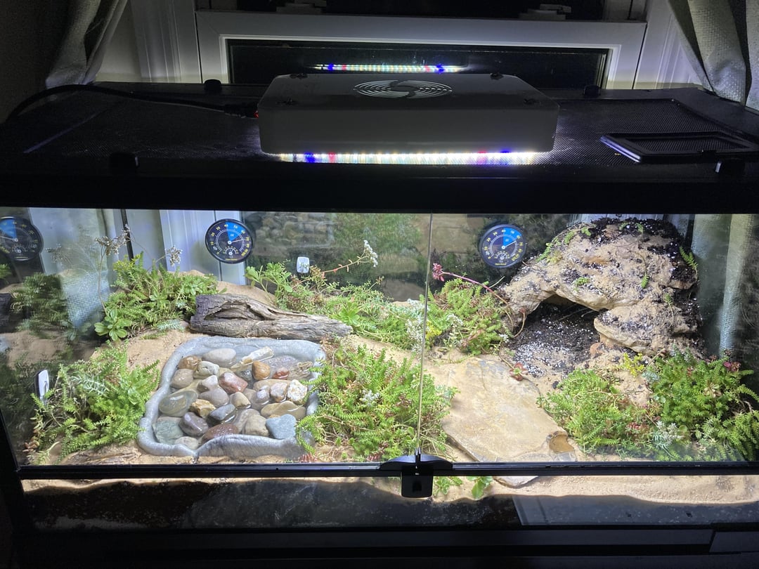 I removed the sand added soil to replace it. I also added a food bowl and some twigs, and removed some stones from the “pond” because it wasn’t allowing easy access to water after evaporation. Still planning an arid environment with arid plants, and still hoping to get a friend to live in here one day. I would like suggestions on inhabitants that would be suited to this tank(with species specific improvements) the only limit being no snakes and no large arachnids. My partner won’t approve, but anything else is fair game. Important notes: shallow substrate, live plants, and this is a work in progress. I keep aquariums and prefer to build a tank and figure out the problems and routines before getting the pet.