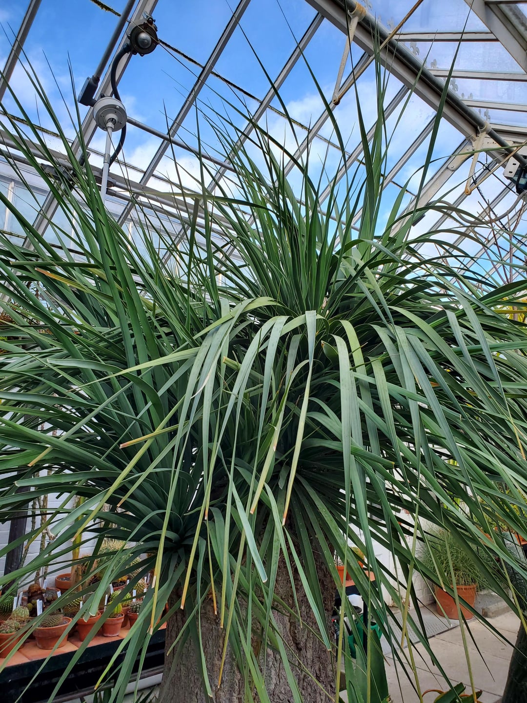 This tropical relative of asparagus is an upright, fine-textured evergreen tree that grows very slowly, up to 30 feet in height. It has a greatly swollen base (sometimes 7 feet across) which narrowly tapers in older specimens. The light green leaves, up to five feet long and ¾ of an inch wide, are produced in tufts clustered on the tips of branches. The cascading nature of the leaves gives much the appearance of a pony's tail. Creamy yellow flowers are quite showy as they are held up above the foliage in spring and summer. The tree will occasionally flower 2 or three times a year. Height 12-18 feet, spread 10-15 feet; crown uniformity is irregular.