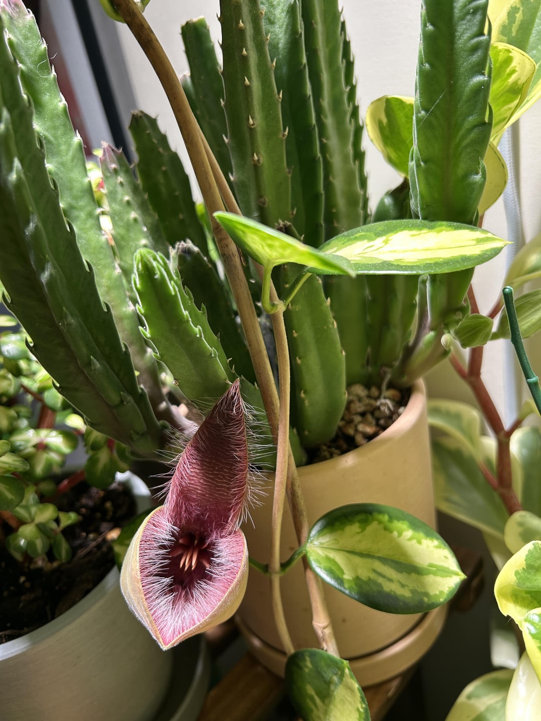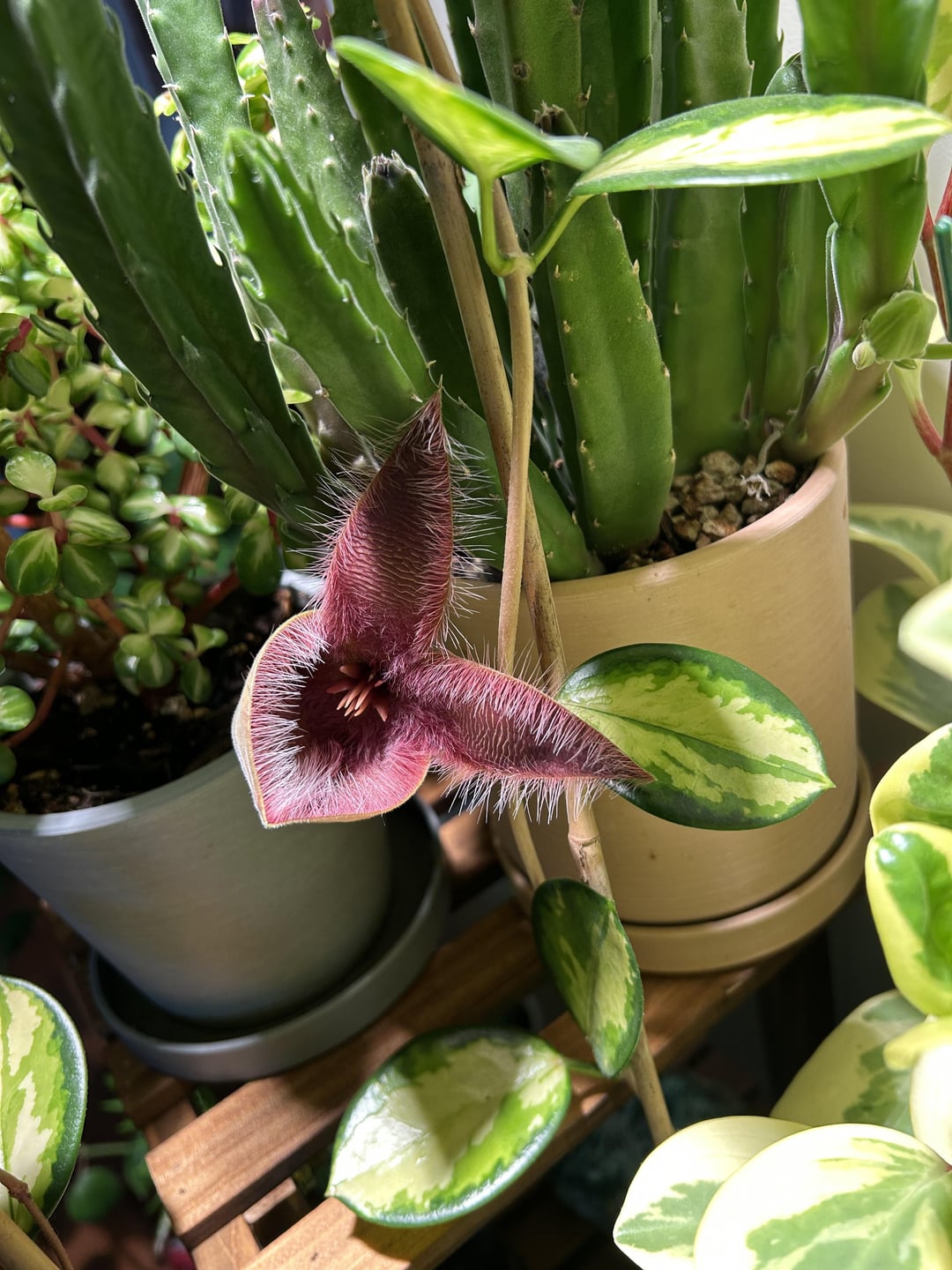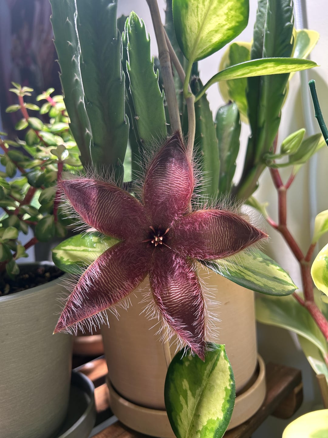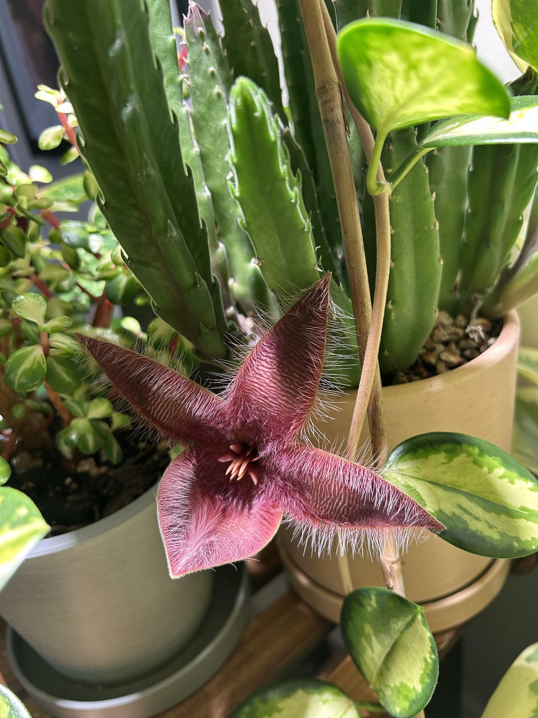 second stapelia flower this summer! two more buds are swelling, i’m over the moon. wish i had a tripod to do time lapse this morn, or just the time to sit and watch this unfold. unfortunately i was getting ready for work and just kept walking by to see progress. happy new moon y’all ✨