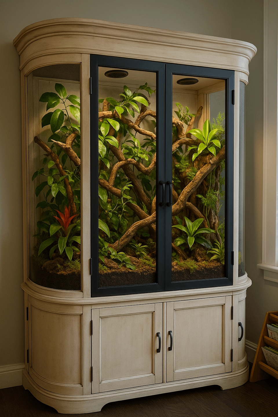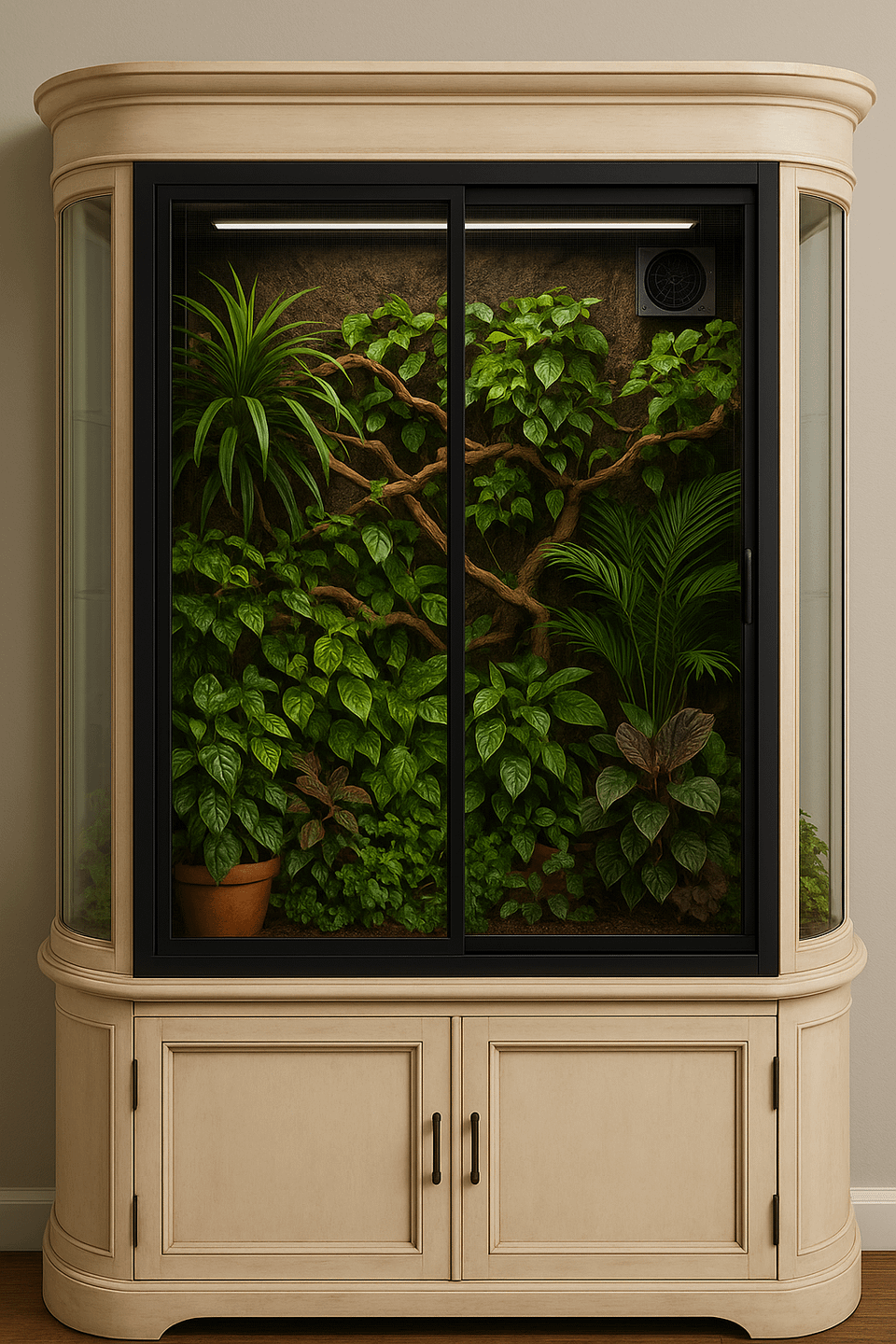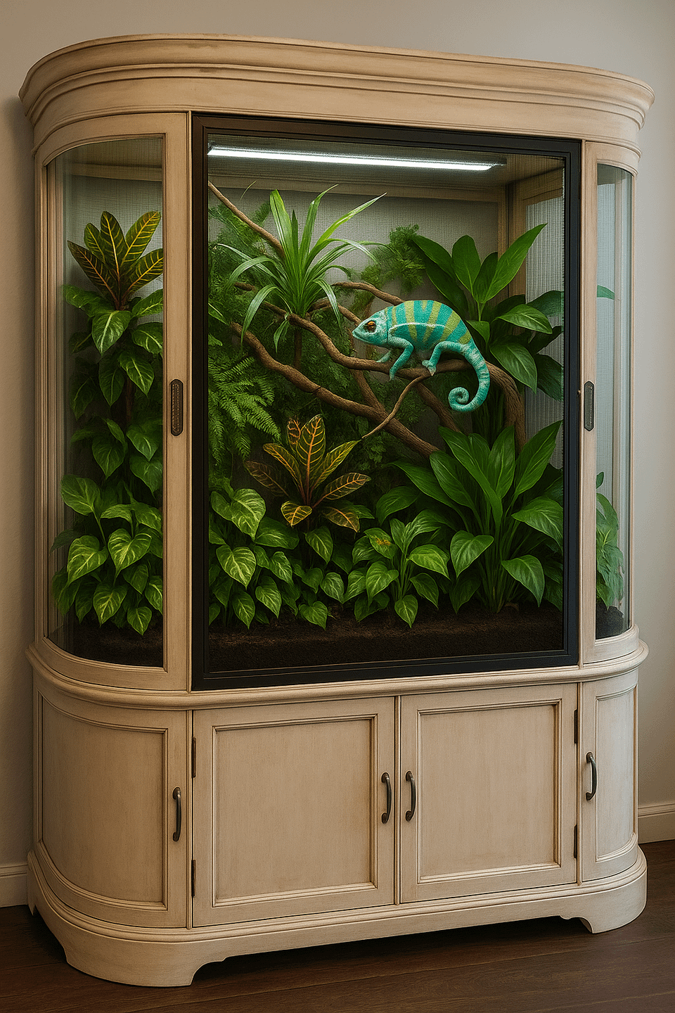 We have this curio cabinent in our front room that is really just a storage unit. I'm going to start he process of turning it into a vivarium. Ultimate goal to hold a chameleon in it. Species to be determined based upon the environment I can create. I threw some renderings into chatgpt for ideas.