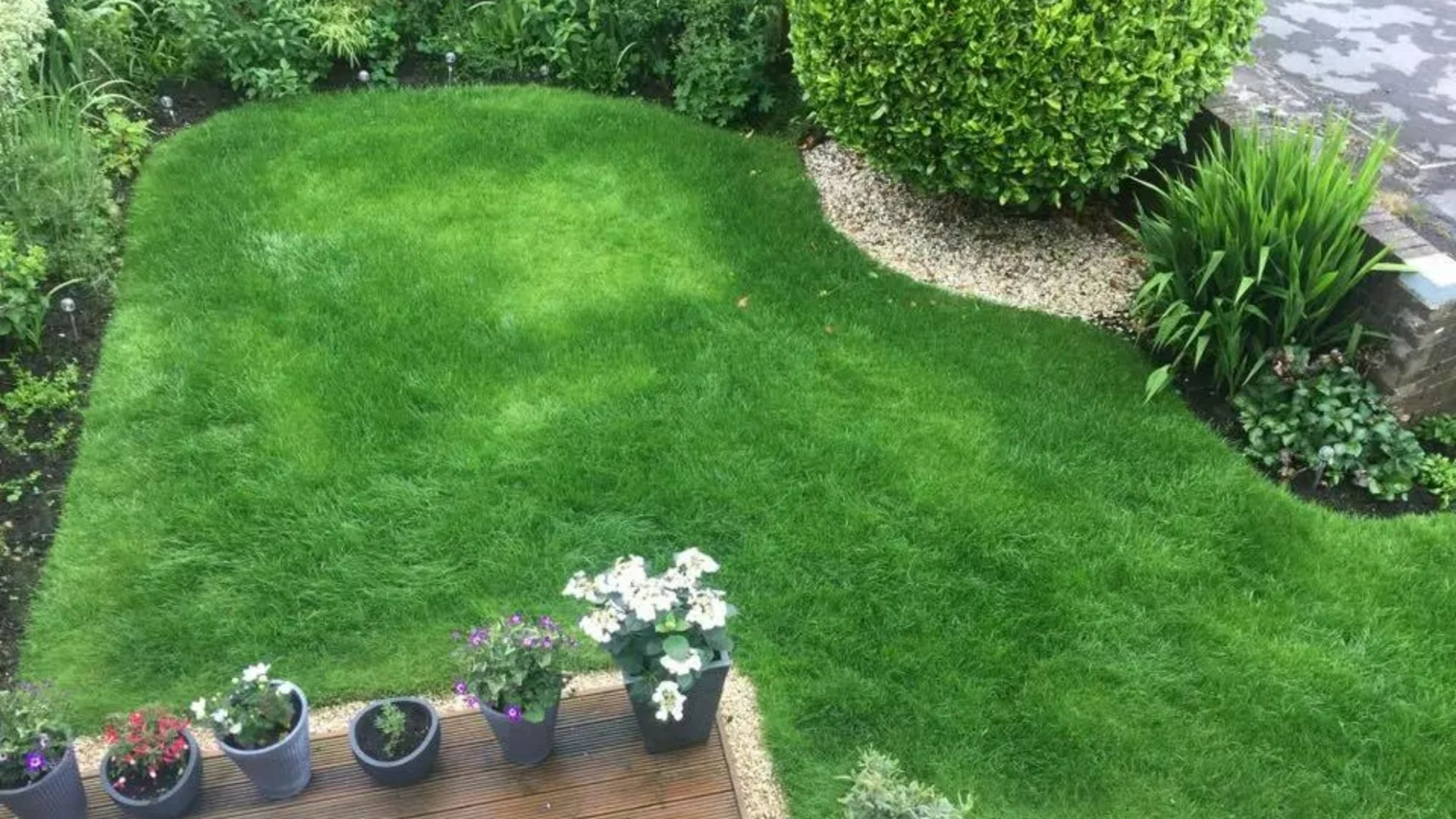 A woman has shared how she managed to transform her lawn from being patchyCredit: FacebookOverhead view of a garden with a green lawn, potted plants, and a wooden deck.