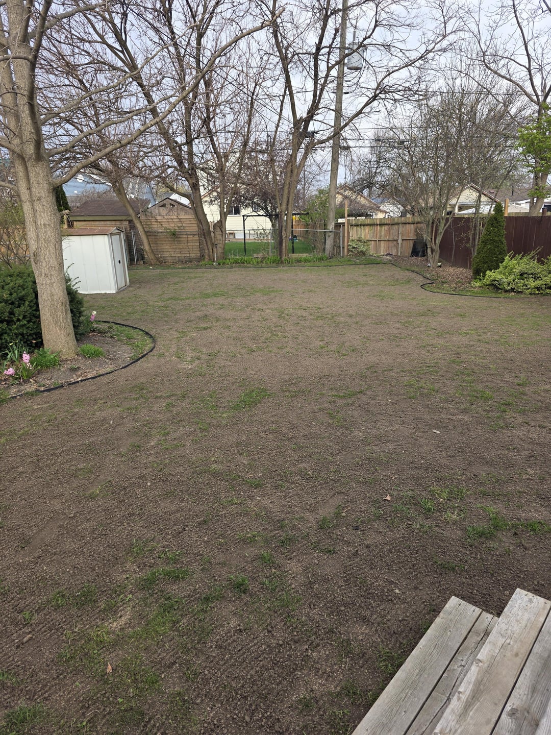 Spread about 8 yards of topsoil over around 2800sqft backyard and spread seeds bought from striped seed in Canada(PRG, KBG, creeping red fescue mix). Had a great germination rate. Seeds started sprouting everywhere at around day 10 and the bare spots were filled in by around one month. The last picture is 2 months since overseeding. Pretty happy with the results đ