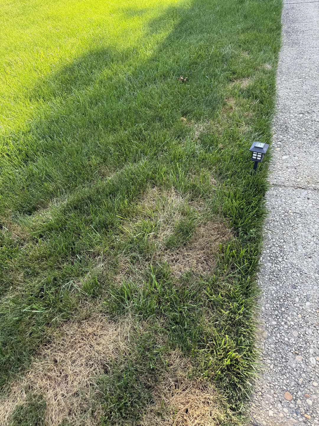 Looks like 2 different things: heat stress from that crazy hot weather we had and pet damage near the curb.