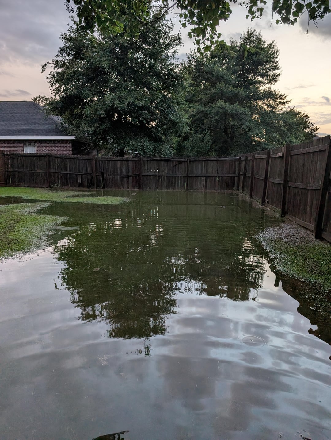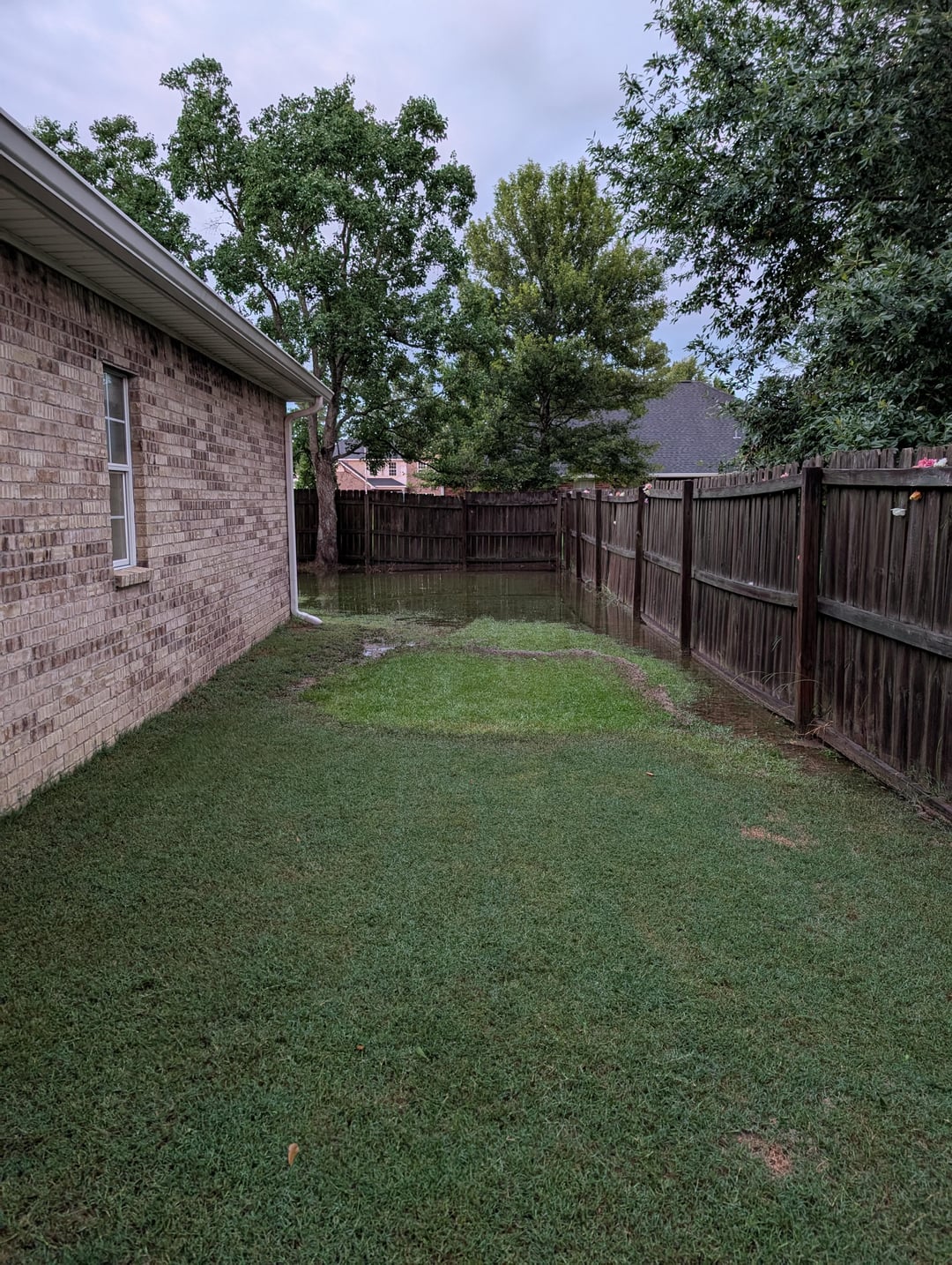 You do have low areas in your yard…you can see at least a 4 inch drop on the back fence where you neighbor’s shed is…you should bring in soil.