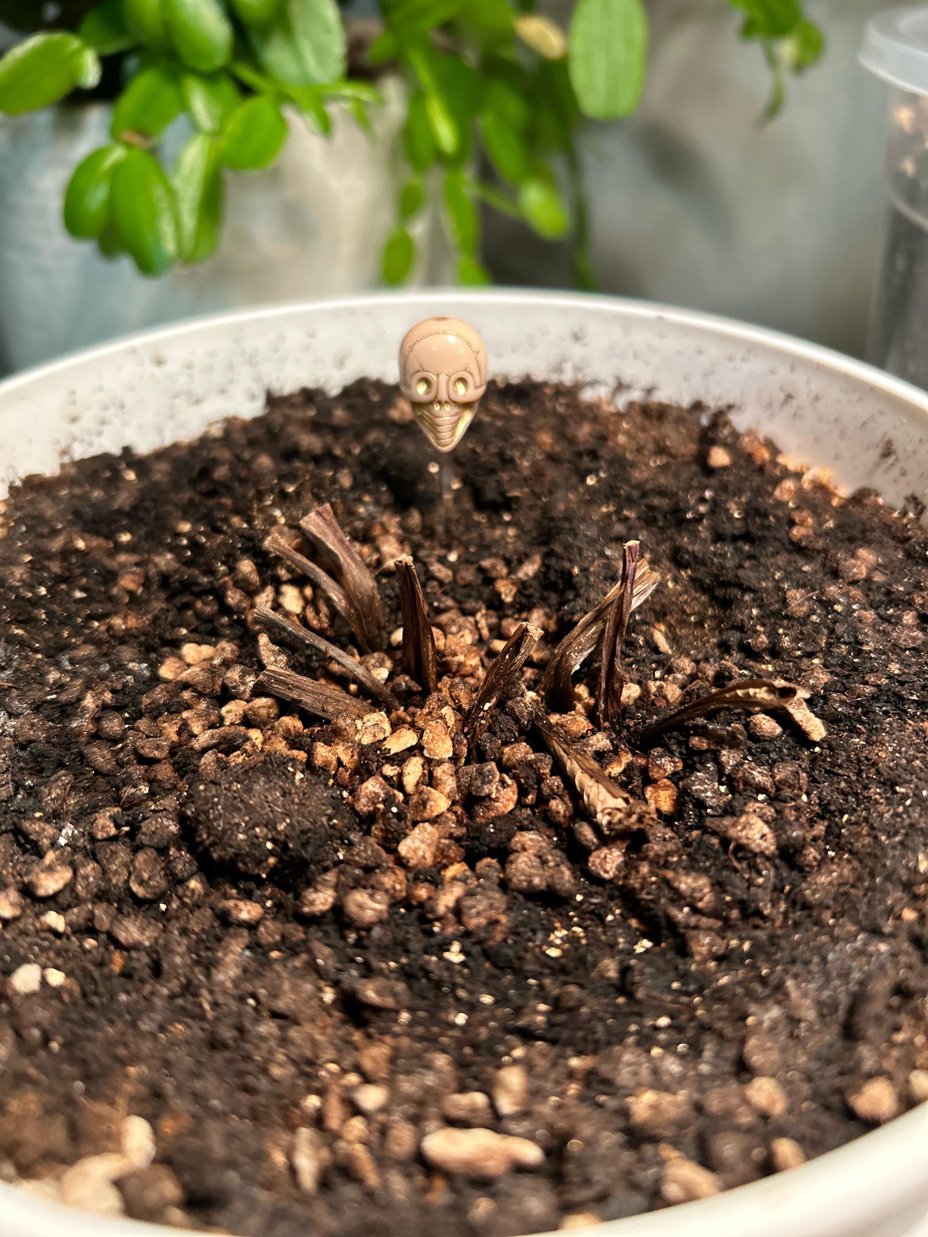 (A pink bead on a stick is the reminder I use for all of my plants that need distilled water. I didn’t need the pink skull to remind me that this thing is deceased. 💀)