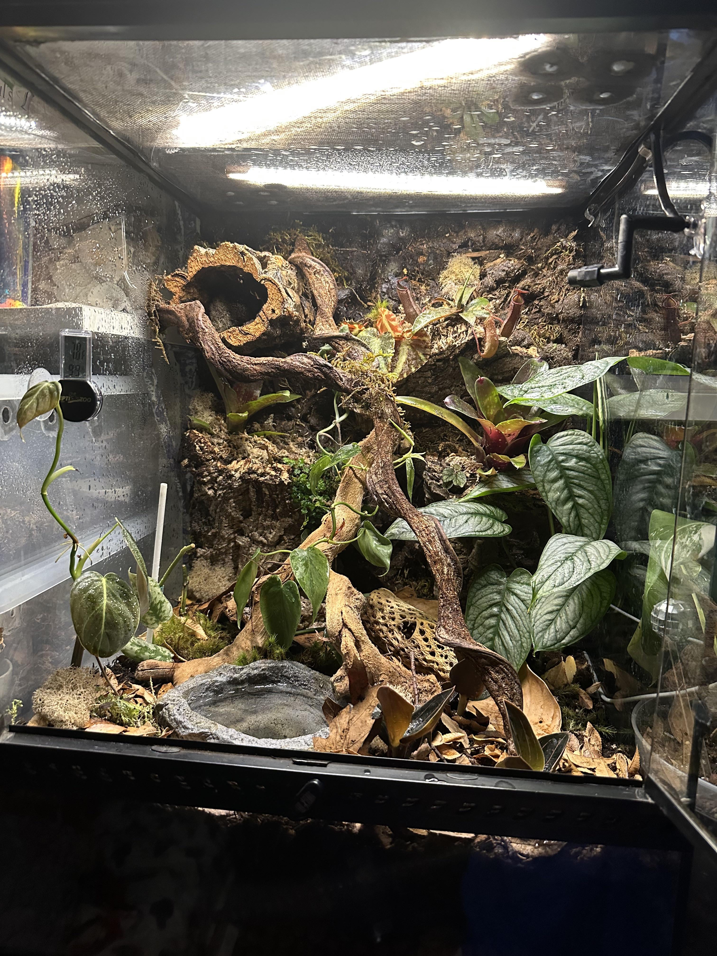 This is my first vivarium build! I think it turned out so good! It’s 18x18x24 it’s for four glass frogs, two granulated glass frogs, and two northern glass frogs. I'm pretty sure I have at least one male northern because he chirps all night long. I can’t wait for everything to grow in so I can put my kids in. Now I need to figure out temperature control, it is running on the hot side for my liking in the daytime. I also need to decide which of my isopods I want to put in. Should I be worried about the moisture levels for the isopods? I know I’m my tubs for them, there’s a dry and a wet side, but that doesn’t really exist in a frog tank. Is there a particular type that does well in high humidity, or does it matter? I have many different types of isopods I could chuck in there. Am I missing anything else?