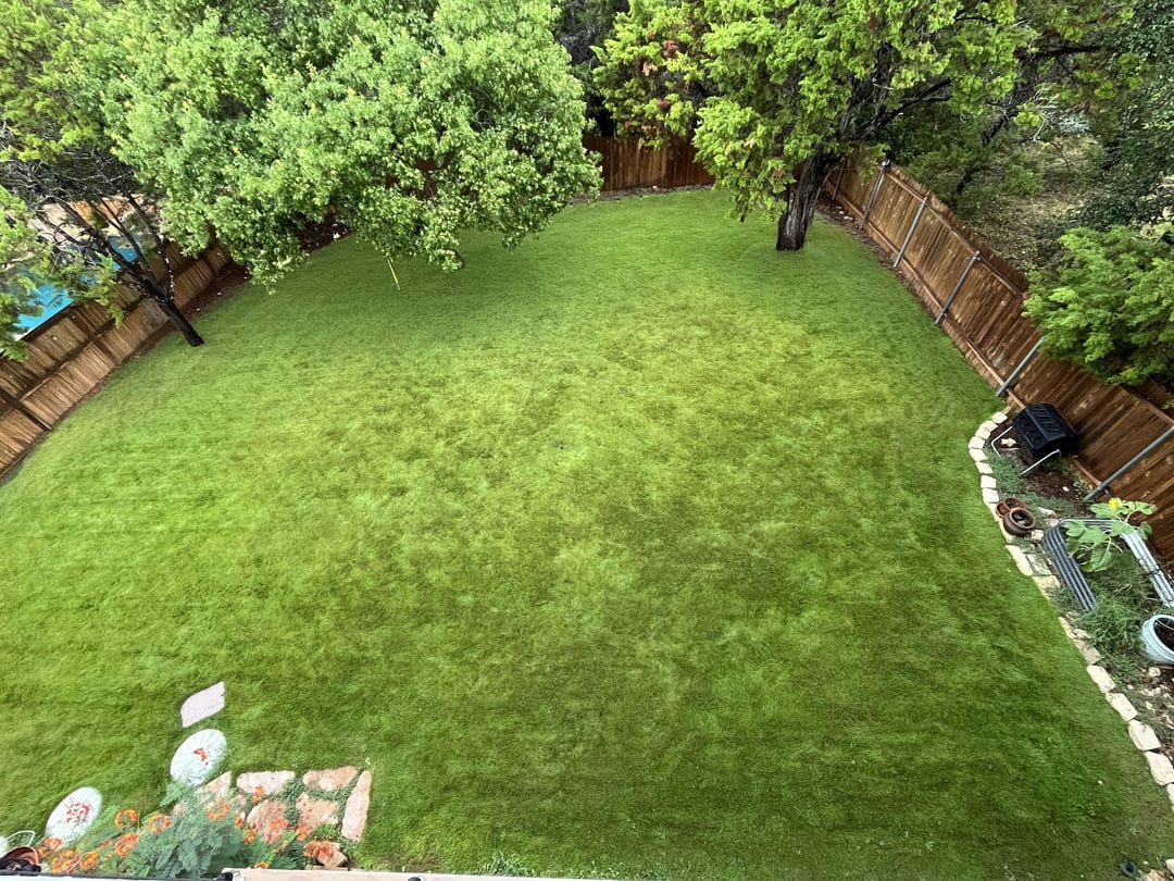 1/3 a can of tournament ready (back and front yard), followed by a watering day and 2/3” real rain and we’re back in business! I might hit that area with some more chelated liquid iron once it dries out a bit to even things out.