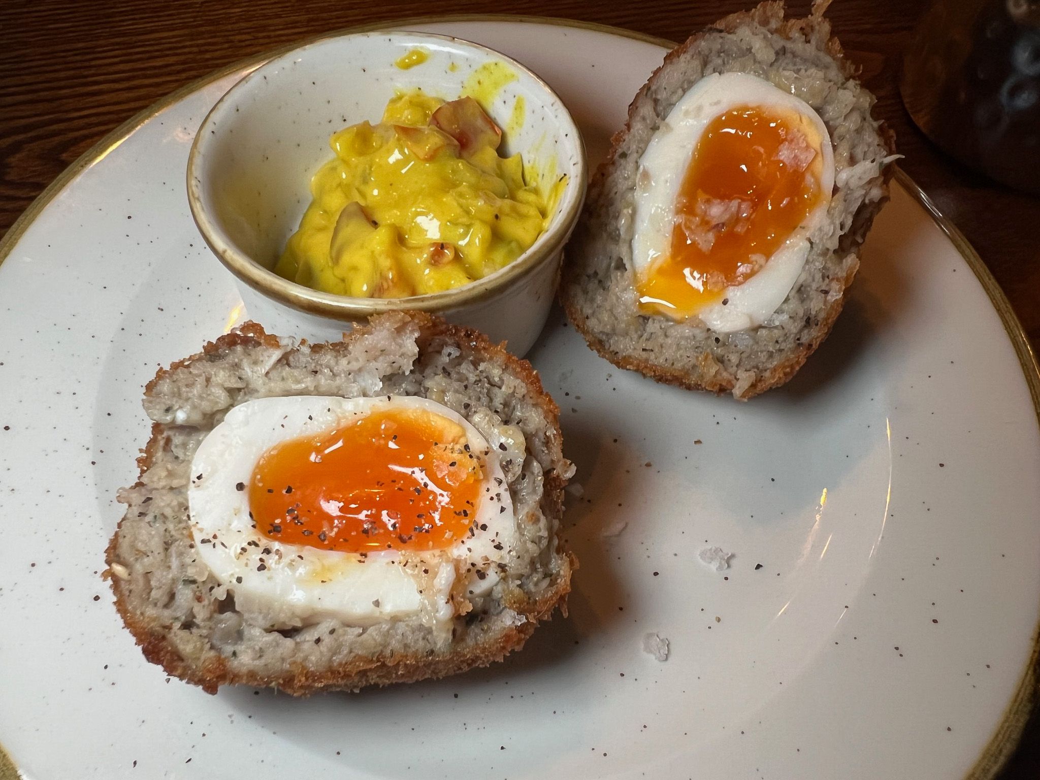 I recognise in hindsight that we over-ordered, but I needed to try all these things. From the small plates we started with a Cumberland Scotch Egg, which is outstanding – served with homemade, fine-cut piccalilli. A perfect pairing.