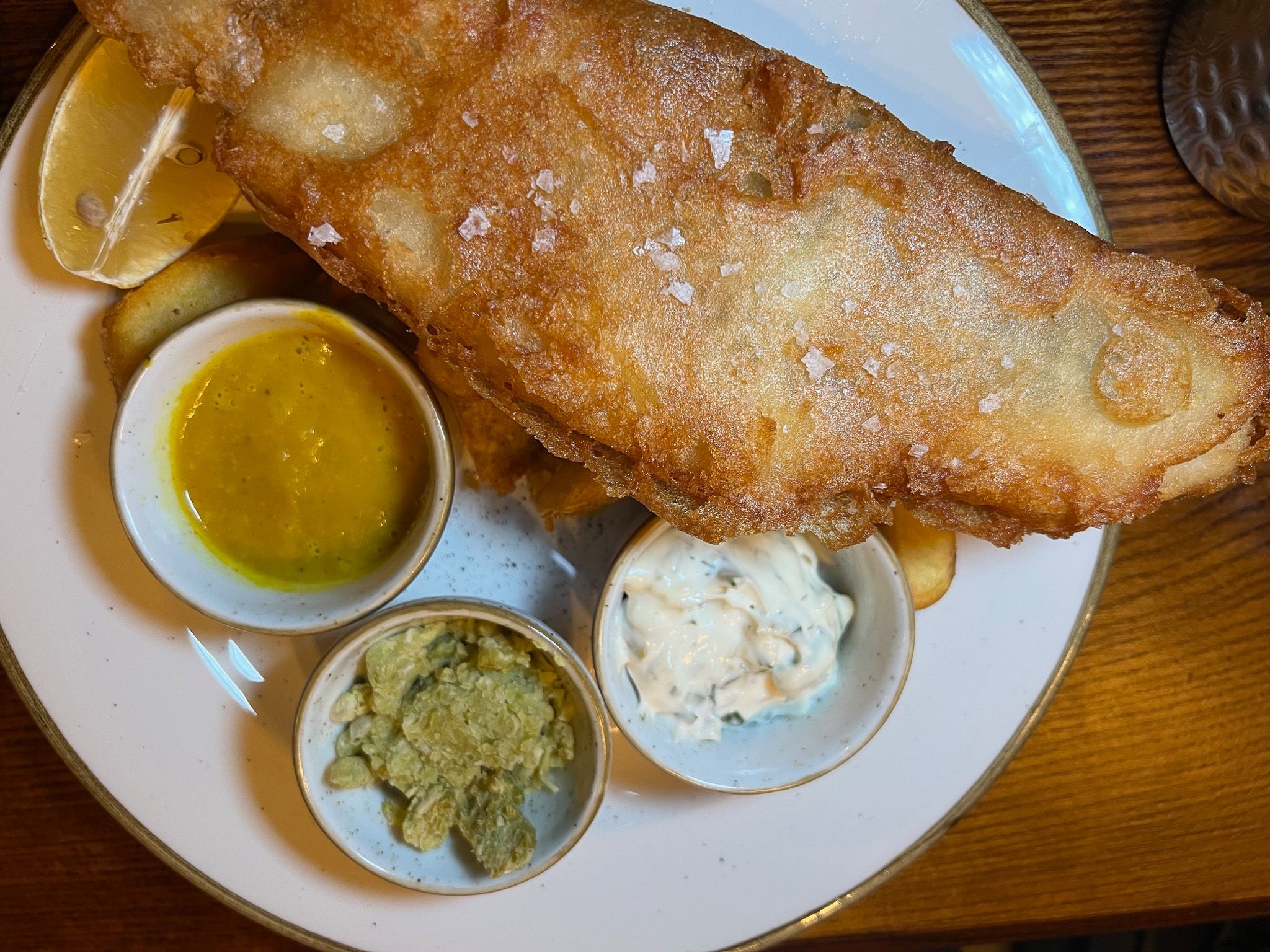 The fish is spot-on; translucent and flaky, served on triple-cooked chips with a trio of sauces: tartare, ketchup, and curry sauce (nice touch). The chips are chunky and proper, while the mushy peas are natural, pale and honest.