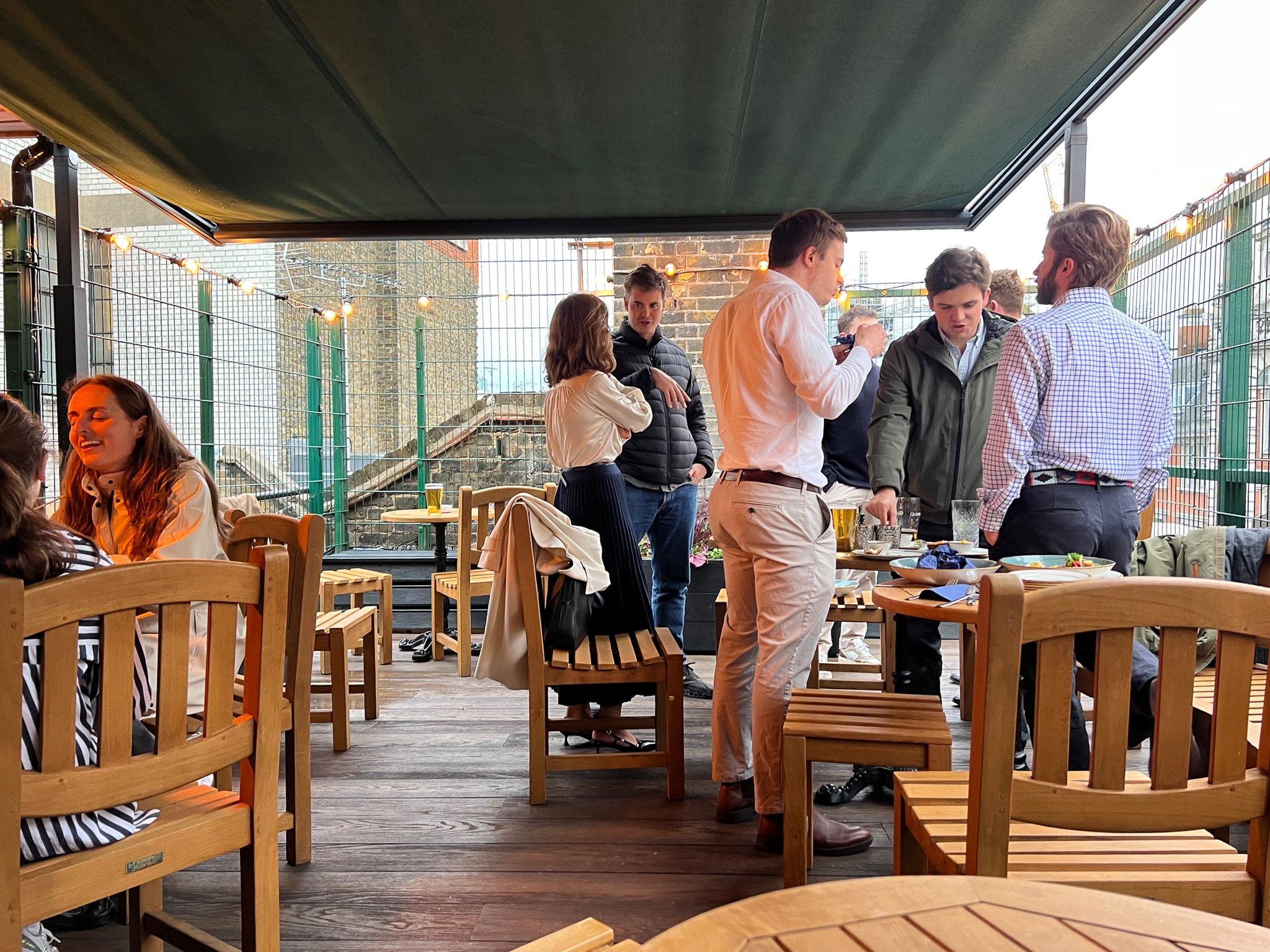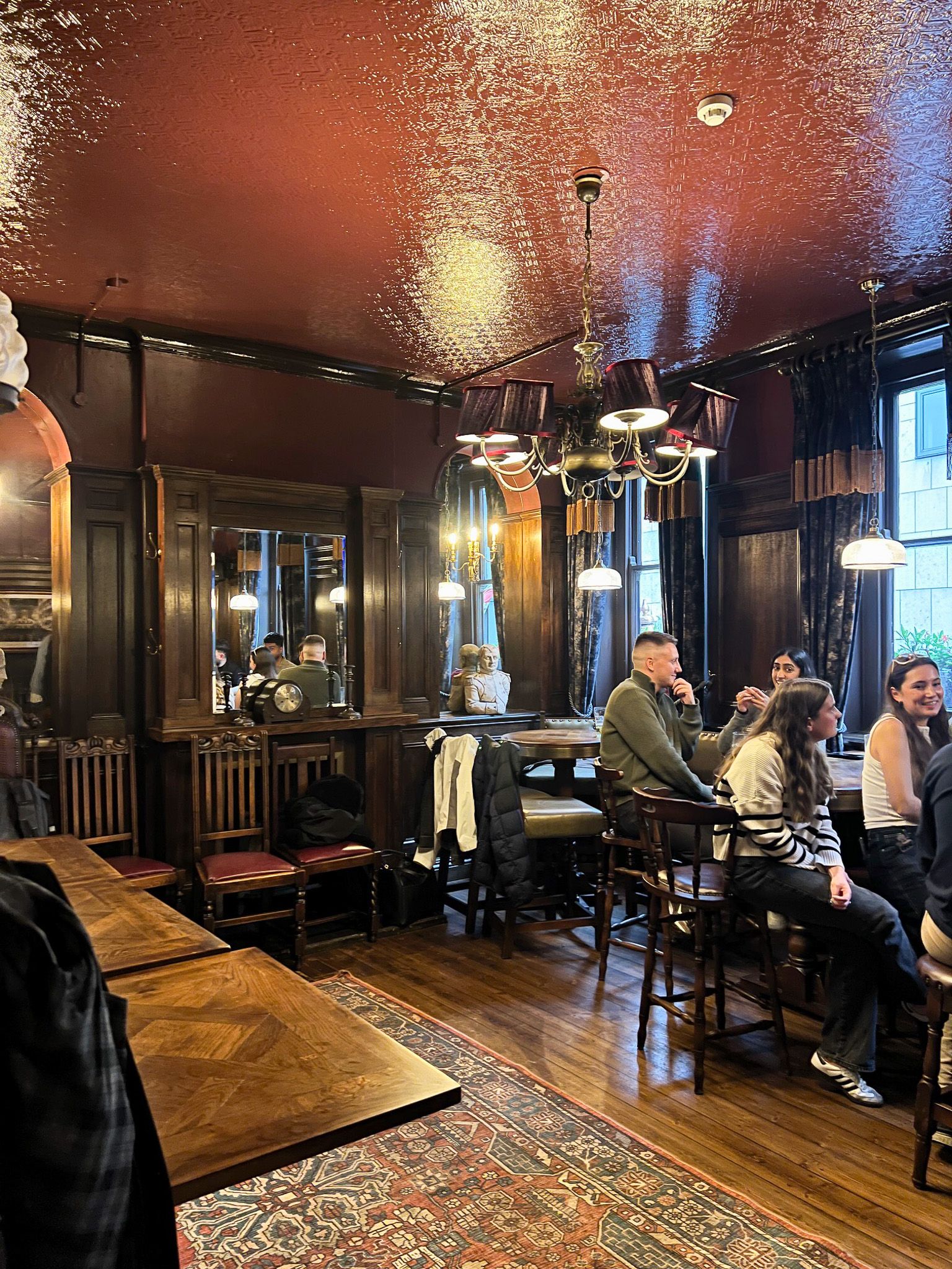 The interiors are dark, yet warm and welcoming. The walls are lined with old prints and photos, the ceiling with deep, glossy anaglypta. It’s ideal for cosy pre-theatre drinks. Each floor offers different nooks and spaces to hunker down in or take over for a private function – and there’s even a roof terrace with pretty views.