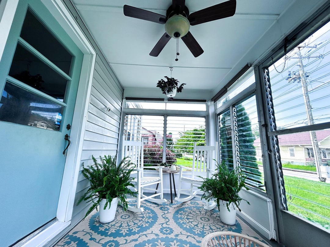 Fixed up and redecorated my porch and super excited about lounging around here with my plants. Faces east so gets very direct morning sun. Is that too much for these plants? I’ve been pulling the shades down for the brightest parts of the mornings to protect my hanging baskets. Ferns, tradescantia, lemon grass. Behind the big chair I’ve got hydroponic buckets with basil and Serrano.
