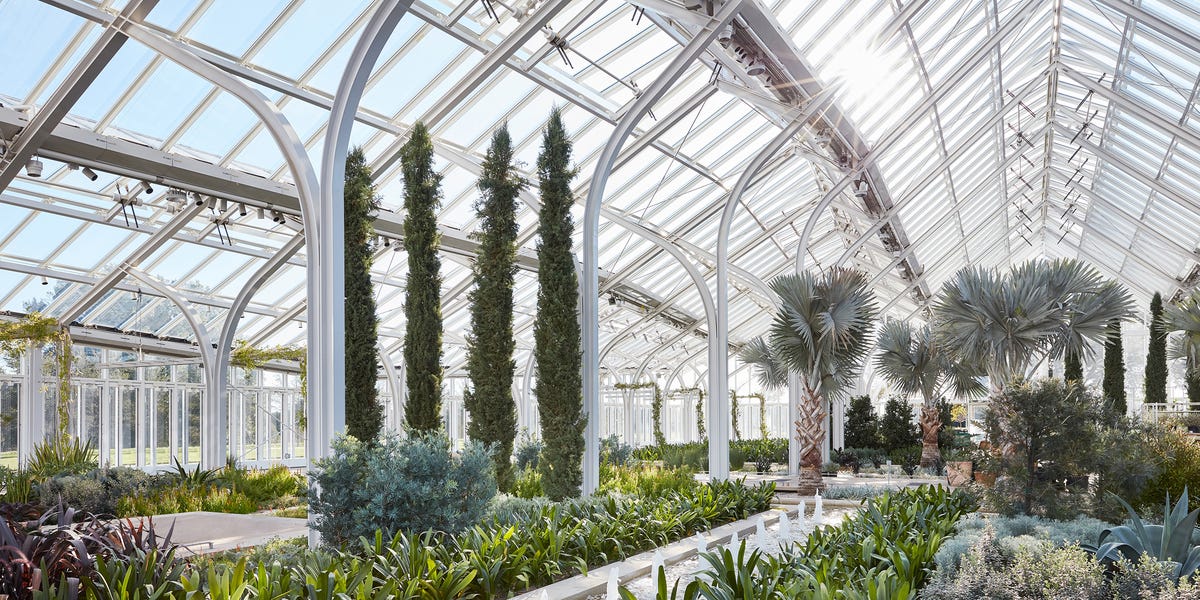 The conservatory also contains a sophisticated water conservation system that collects stormwater from the roof to be recirculated through the conservatory’s pools, canals, and fountains, making it self-sustaining to the 2,000 plant species it contains. The conservatory hosts Mediterranean-inspired gardens, 85 percent of which are intended to remain there year-round and will continue to expand across trellises and beams.