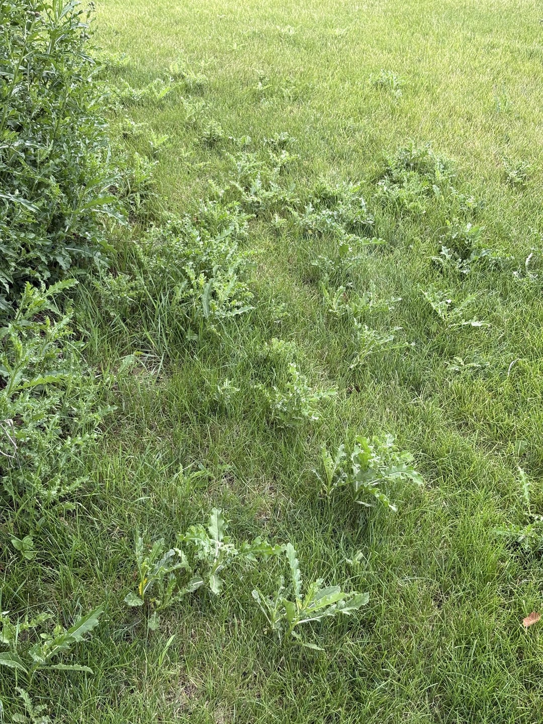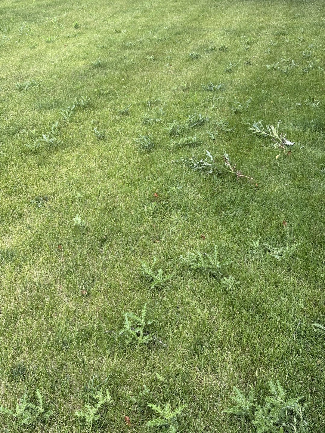 I've got 1.8 acres, riding mower. The house was left vacant before sale, and it's been years of fighting a losing battle. The immediate 2-3 yards around the house is a nightmare thistle situation that I have worked on for hours since the summer began. Meanwhile, the lawn has weeds and prairie plants popping all through it including thistle. I have a 1 year old and I want him to be able to run the yard without hurting his foot on a weed every step.