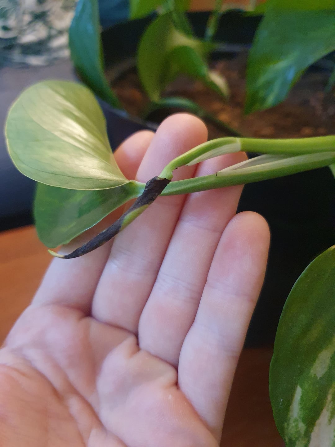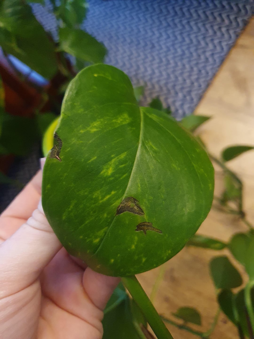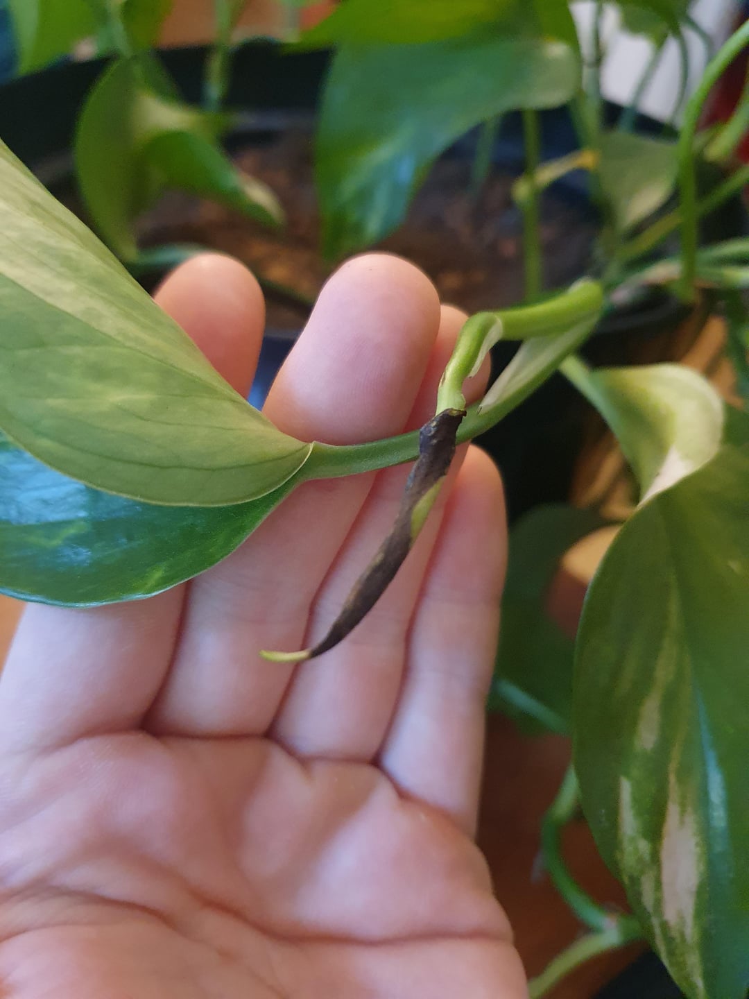 recently re-potted golden pothos, black tips on the leaves of two newly growing ends.