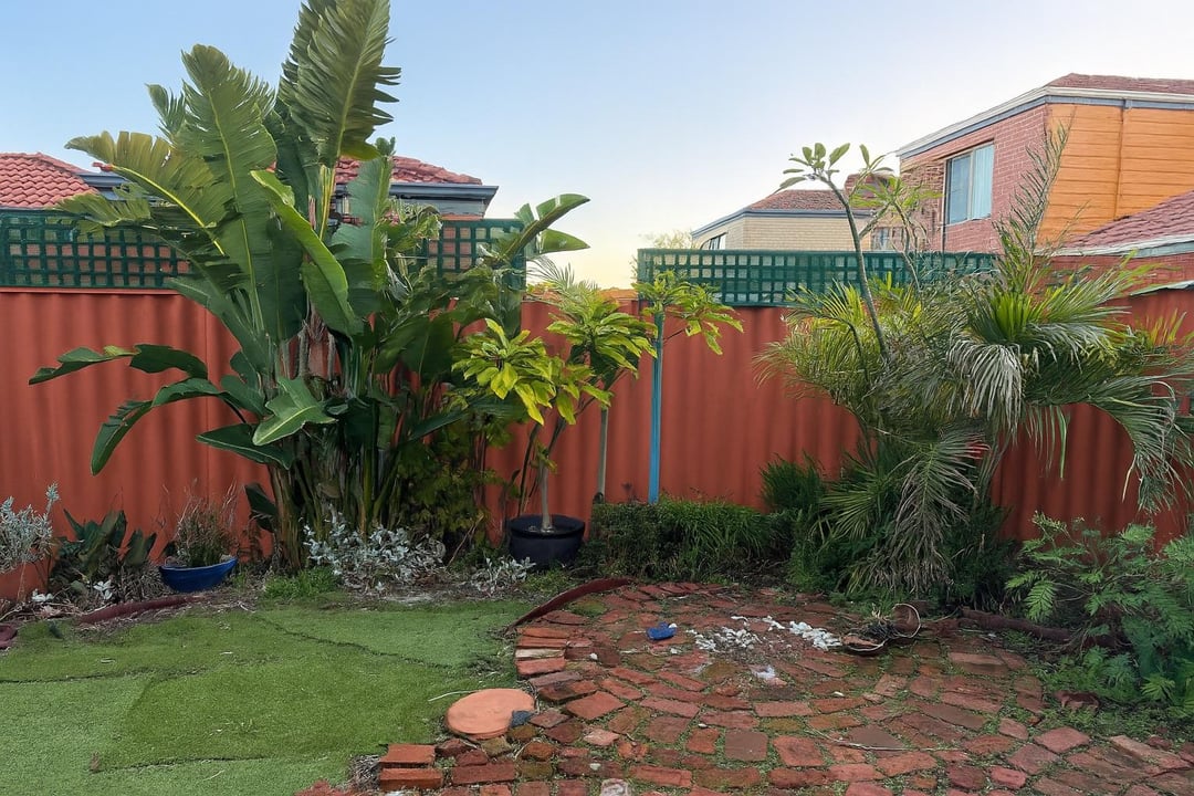 The bricks are so cool and really make the chili color you want on the fence flow in the space. I would keep them personally! Definitely get that turf out! And as far as plants, do you want to keep all the tropicals and add more plants? What’s your hardy zone?