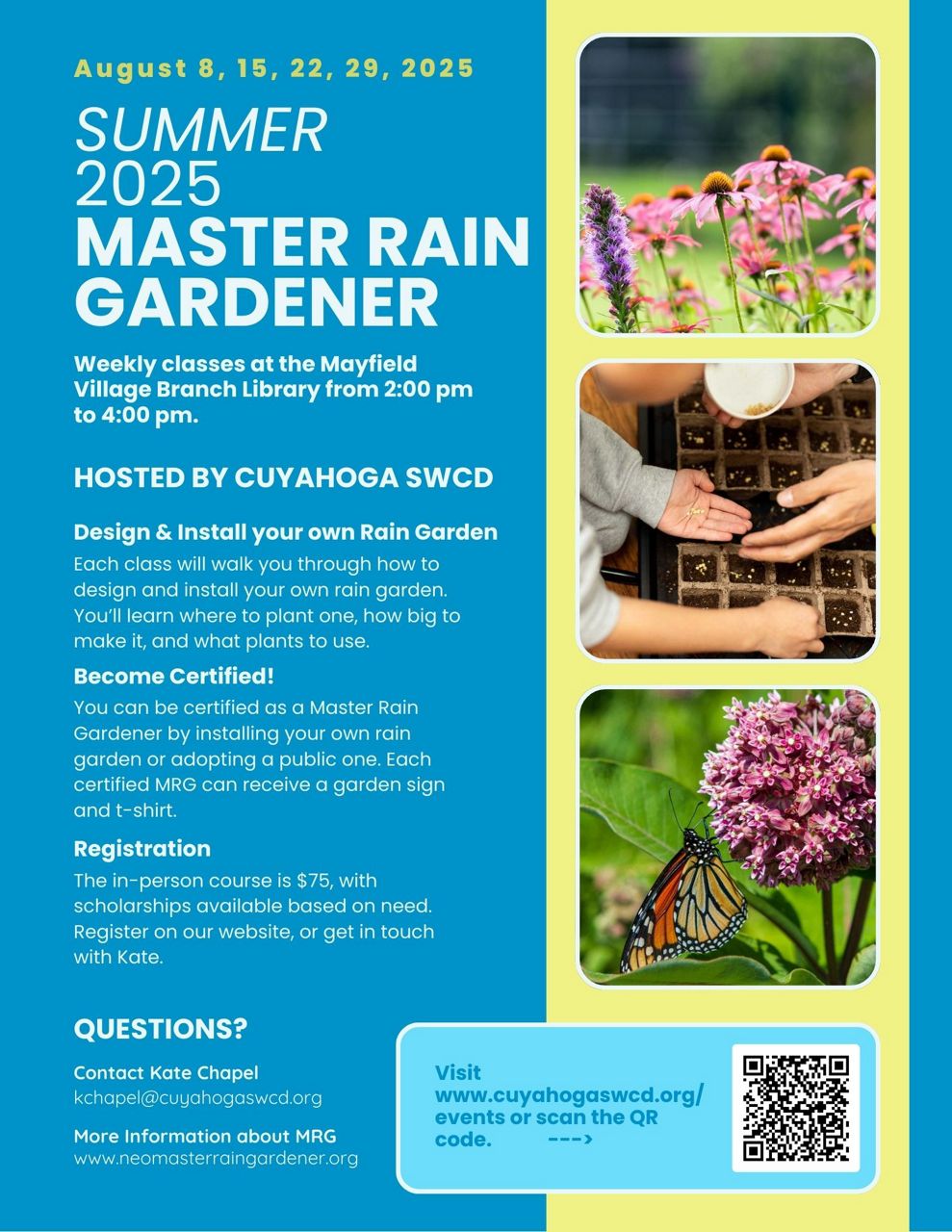 The rain gardener course will take place in four sessions across a four-week time period at the Cuyahoga County Public Library — Mayfield Branch. They will be from 2 to 4 p.m. on Aug. 8, 15, 22 and 29.