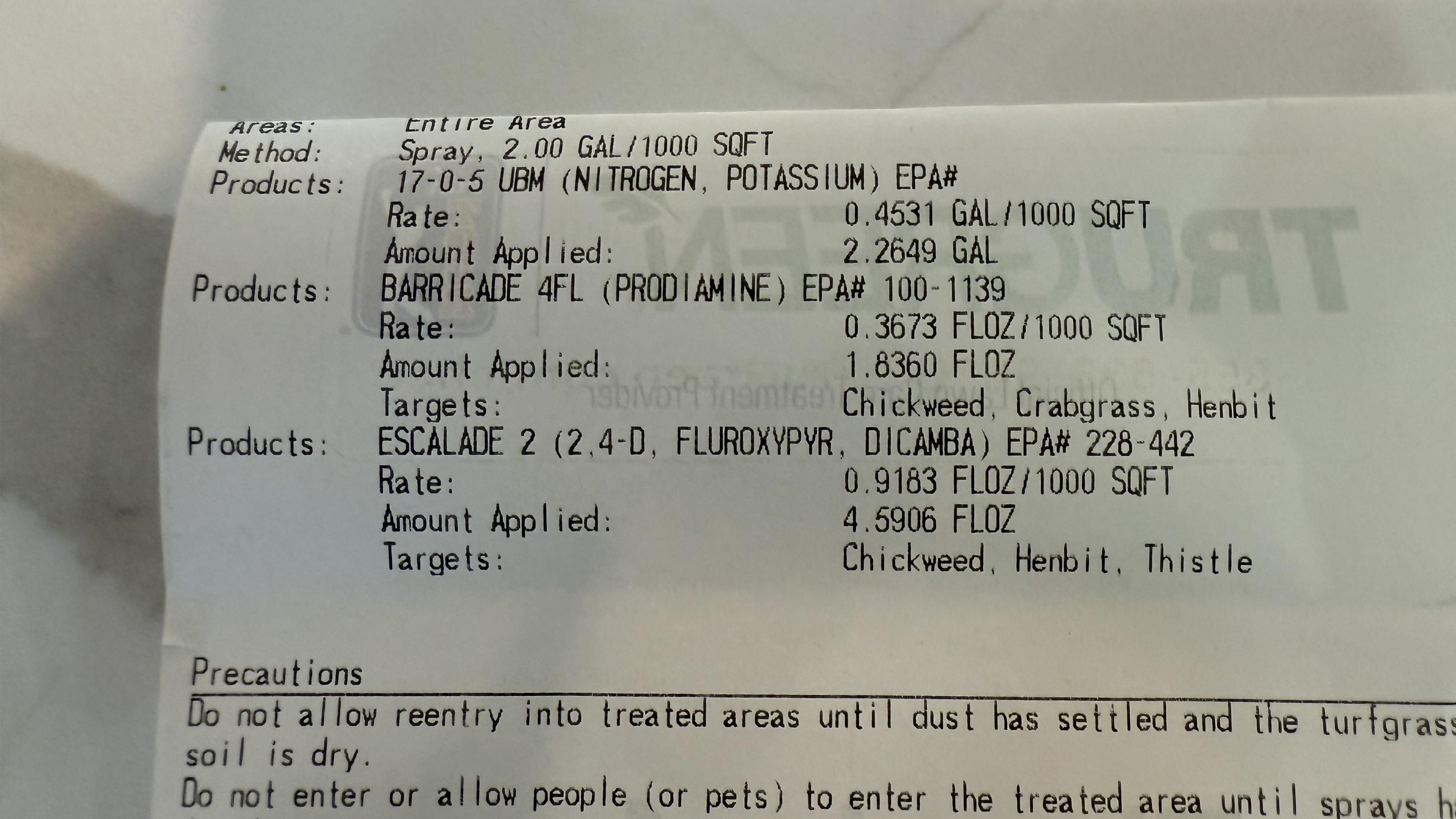 Our company’s invoice from April simply says they applied a granular fertilizer. Trugreen today applied 2.3 gallons of 17-0-5 UBM (Nitrogen, Potassium).