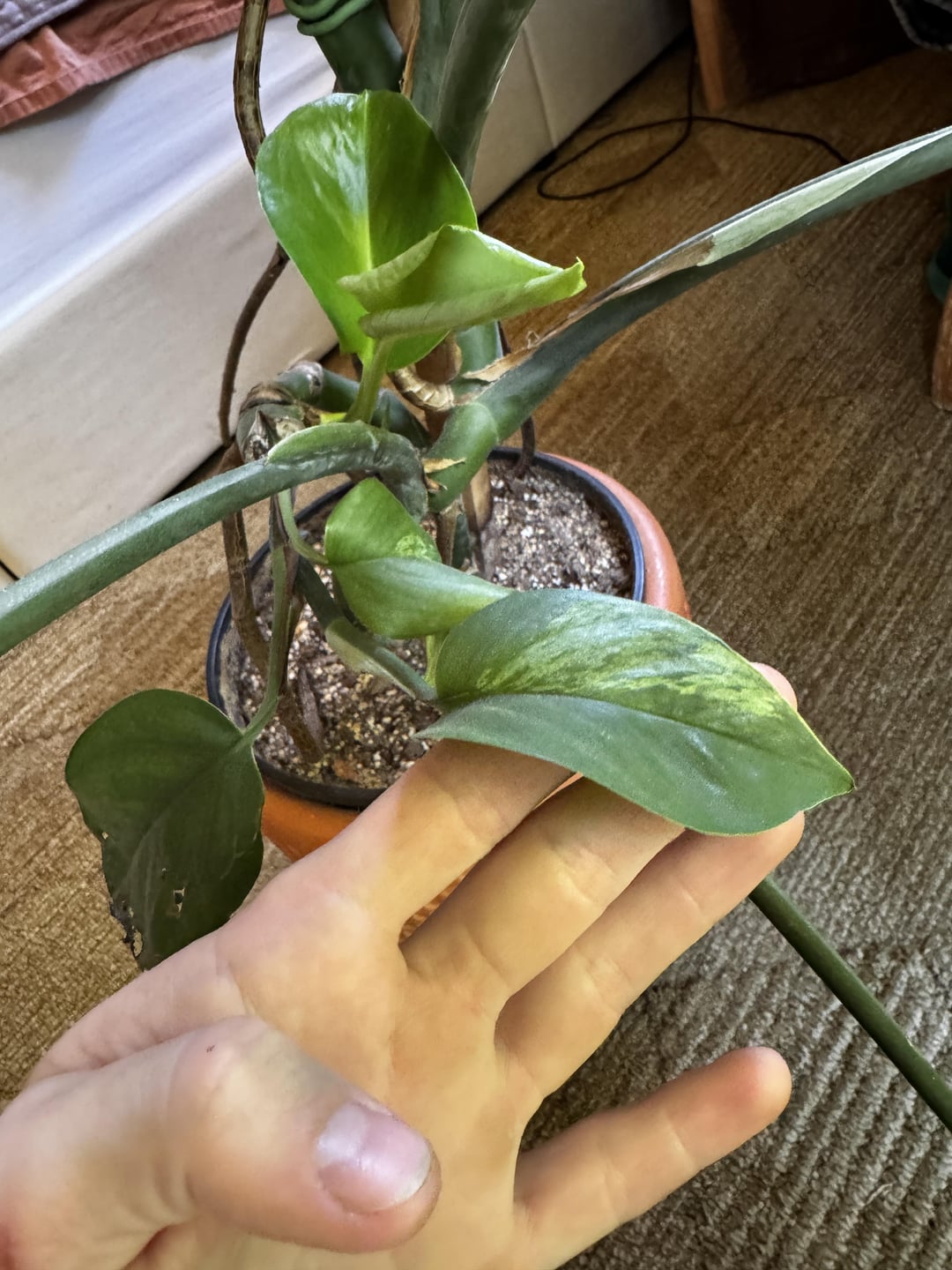 For the first few months nothing notable happened. The pothos never died, never looked too bad or too great, never showed any signs of growth. I started out by pinching off any new growth on the monstera hoping to divert energy to the pothos, but after a while I got lazy and stopped. Now, with the monstera growing little leaves near the top of the stem, the pothos seems to be progressing as well!