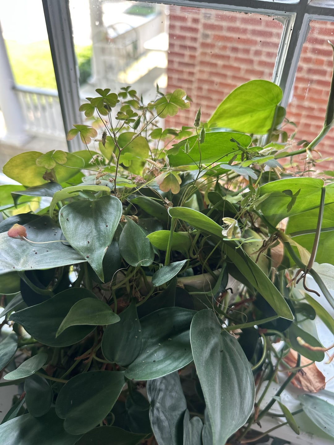 Well… that’s wood sorrel growing in a philodendron and dropping seeds… not clover in a pothos. 🤓