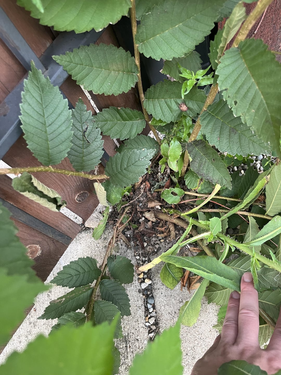 Looks like a Zelkova seedling, such a pain in the ass to get rid of. I spot spray them with 2,4 d