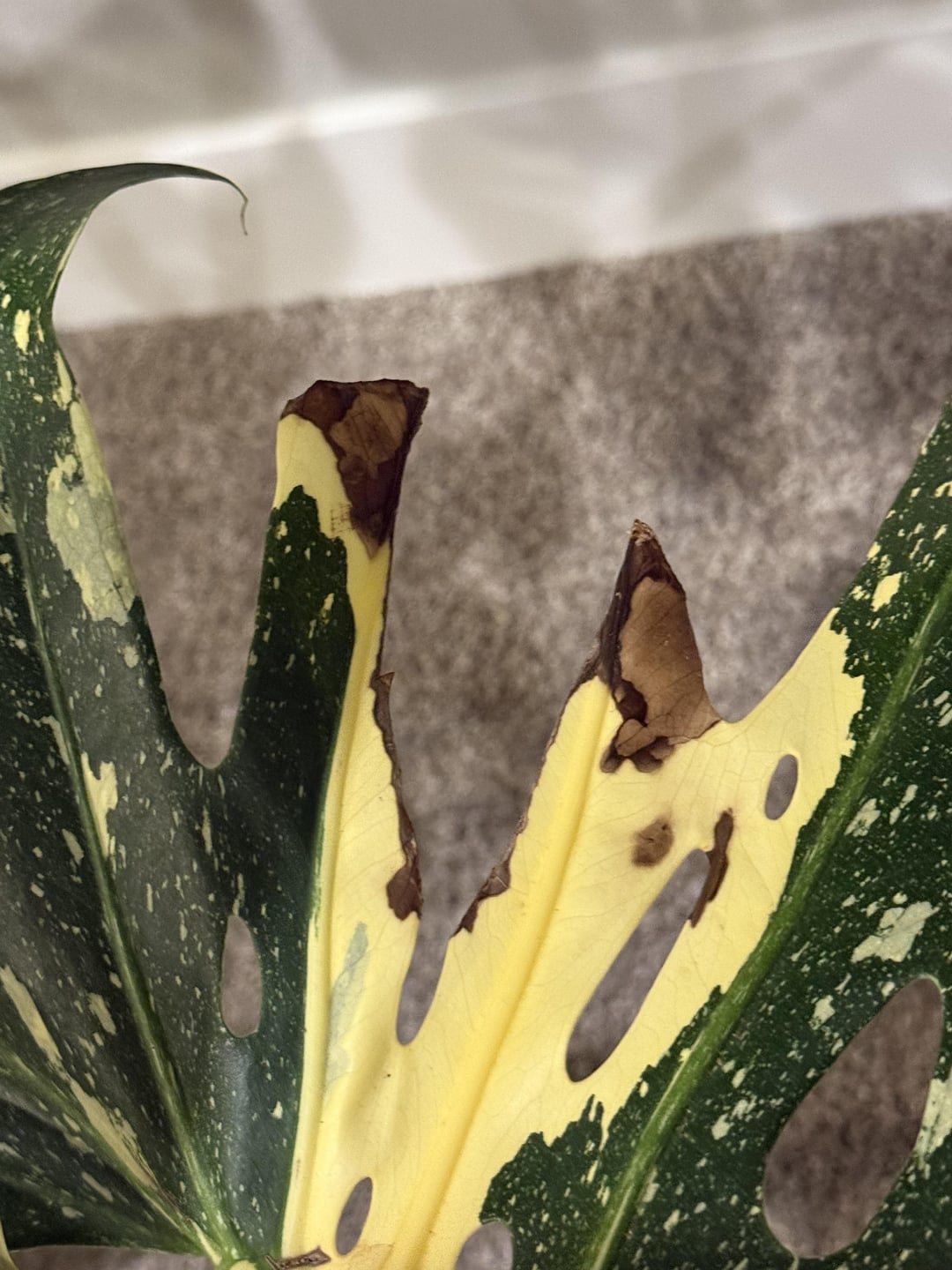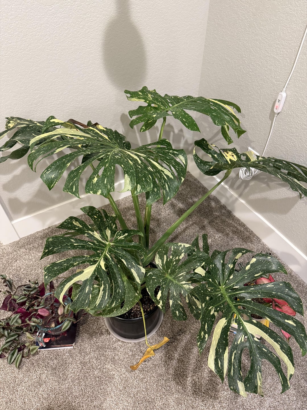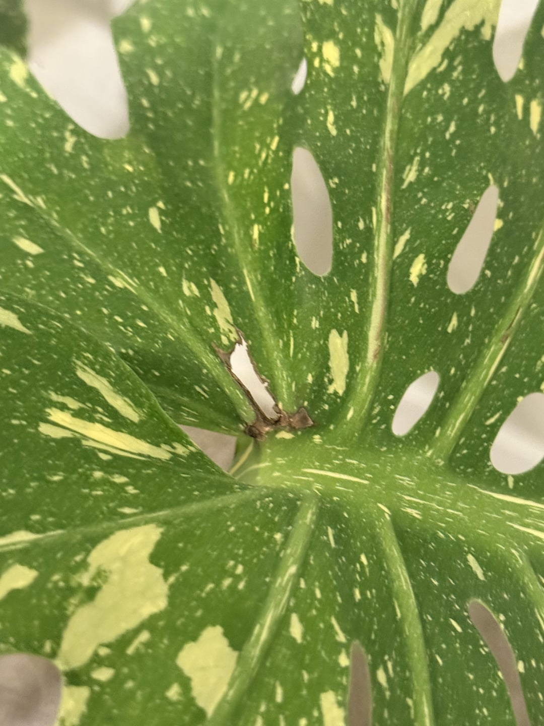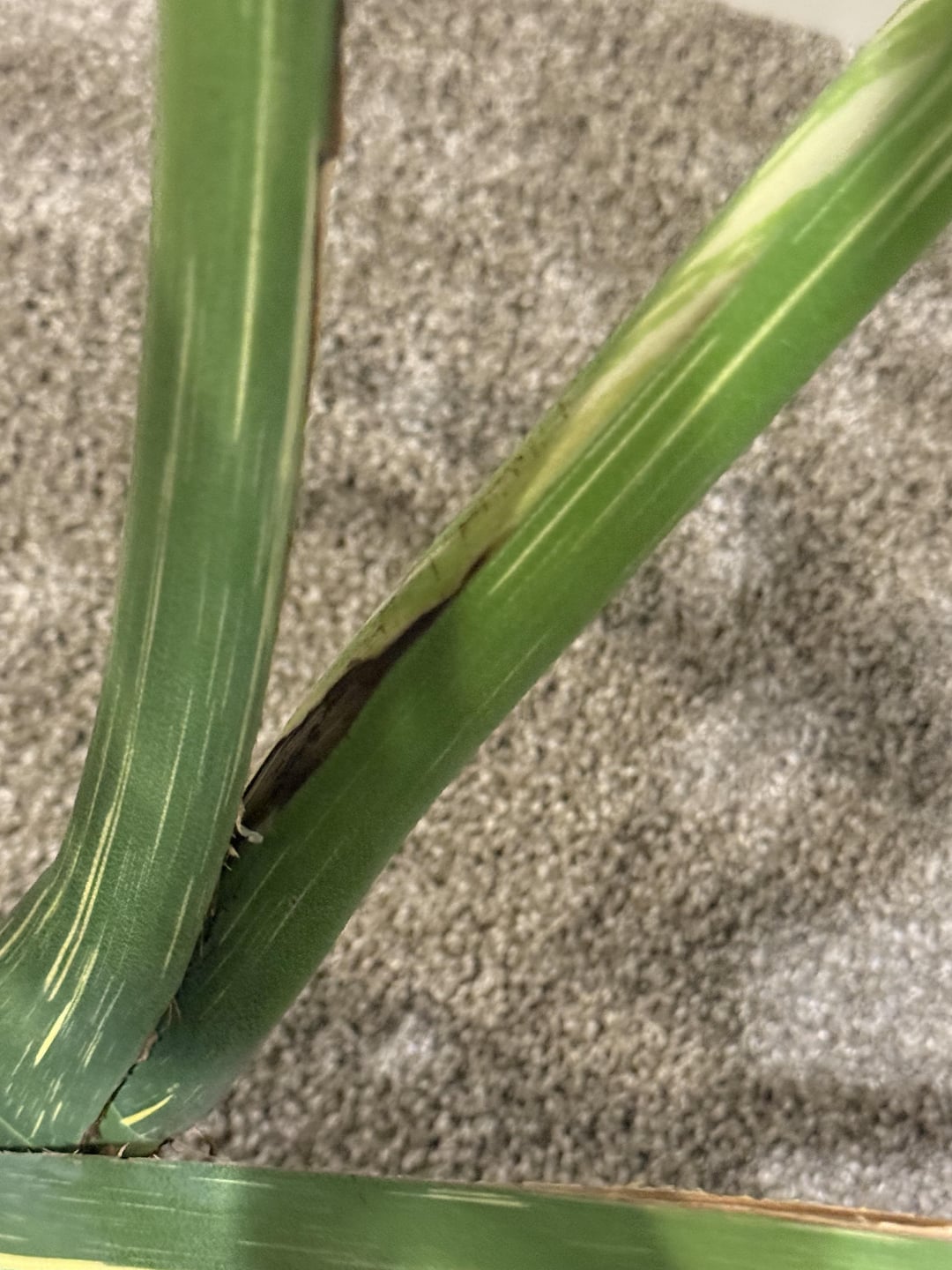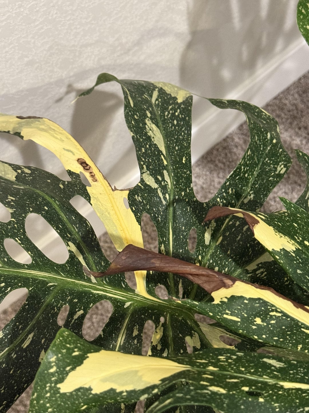 I’m not sure how often to water it, I went a few weeks with no water because I hear over watering is a big risk with thai cons. But I think that’s what caused this yellow leaf at the bottom. Some of the biggest leaves also have browning that’s been spreading since I got this plant. I’m not sure what’s causing that or how to stop it. And it looks like a new leaf forming on the biggest stem turned black when that small leaf turned yellow.