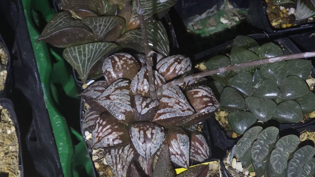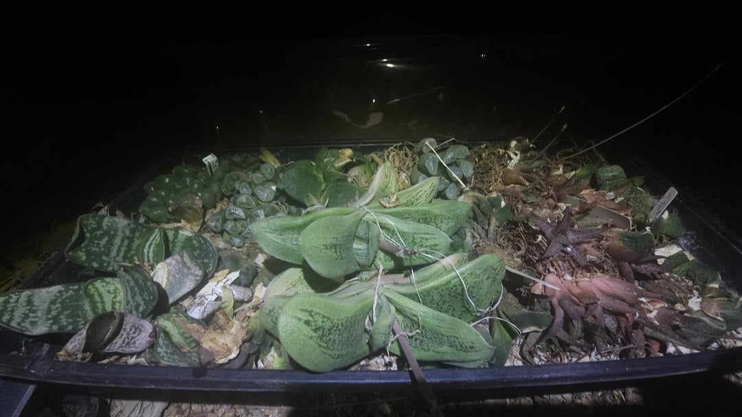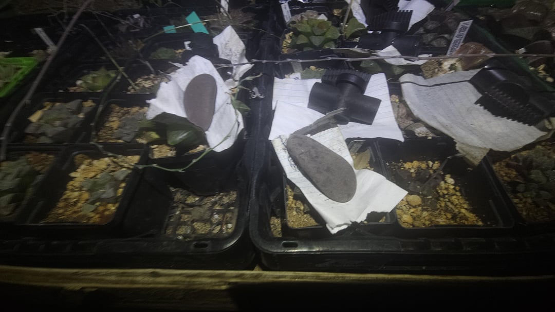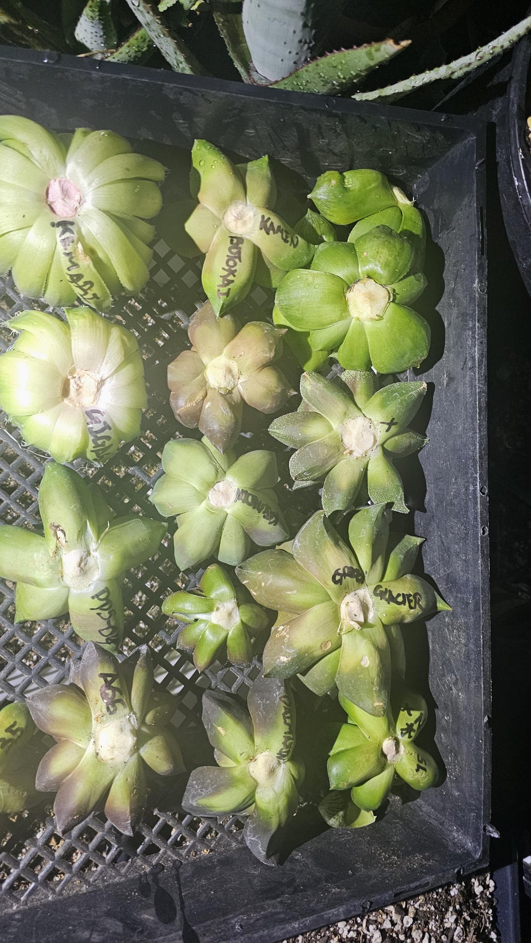 Here are some photos from the greenhouse. I decapitated a tray of mixed hybrids. I leave the bottom row of leaves for pups to sprout from. I put a folded sheet of paper to shade the leaves since these will burn easily having not been exposed to light in a few years.