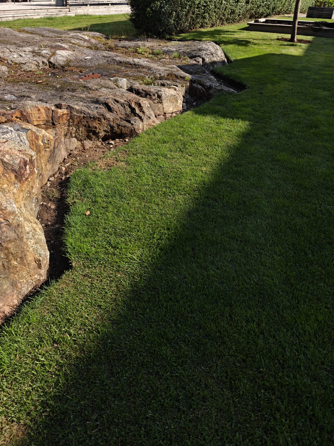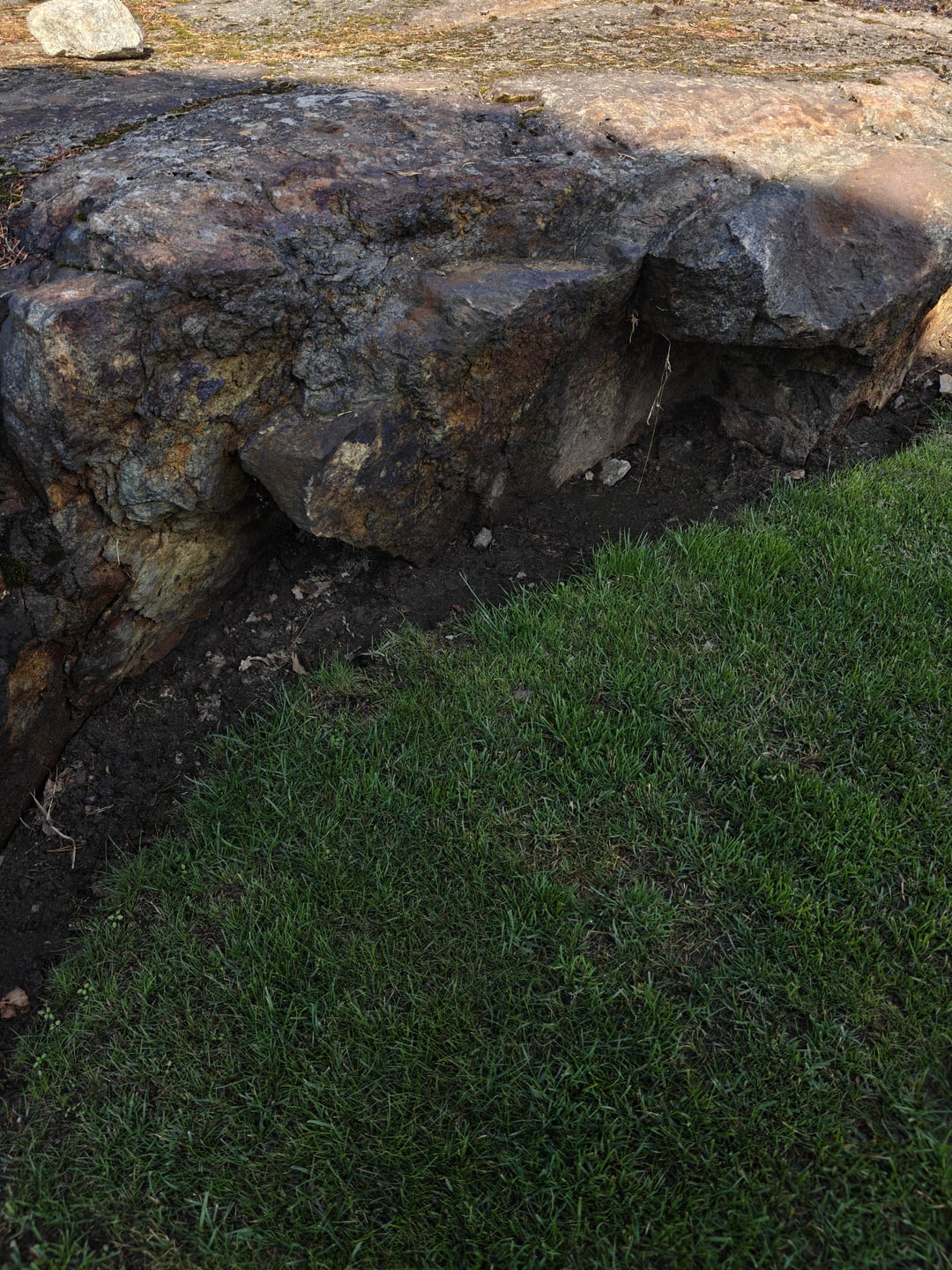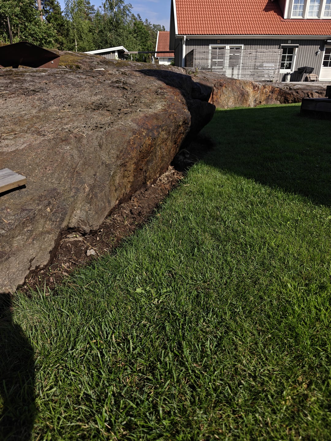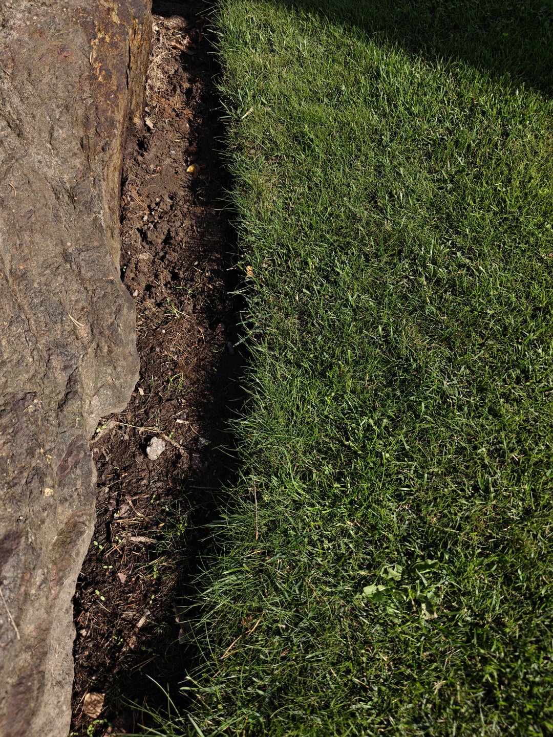 I've dug out a distance from the rock now, this will allow for easier grass cutting as seen in the pictures. I need to fill the gap somehow.