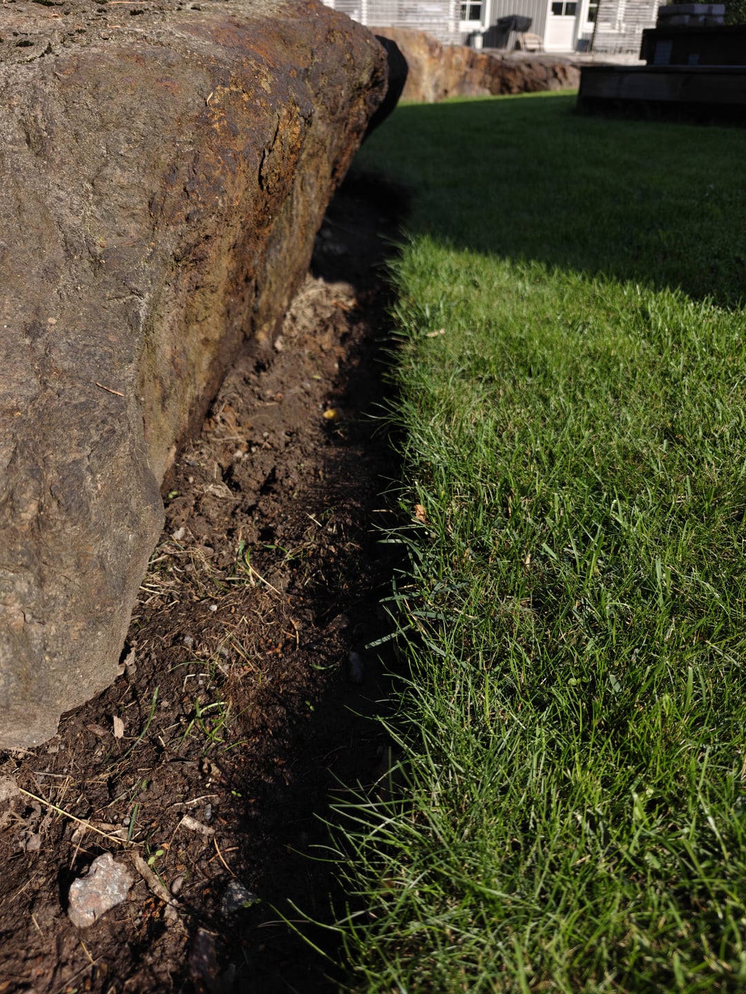 I personally like the grass to go right up to the rock edge… I’d fill it in with strips of matching sod, or try to build it up and seed it.