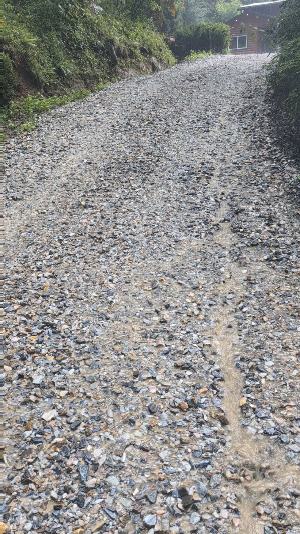Ditches/swales along both sides would help. The water right now has nowhere to go but over the driveway – you basically have a gravel creek bed.
