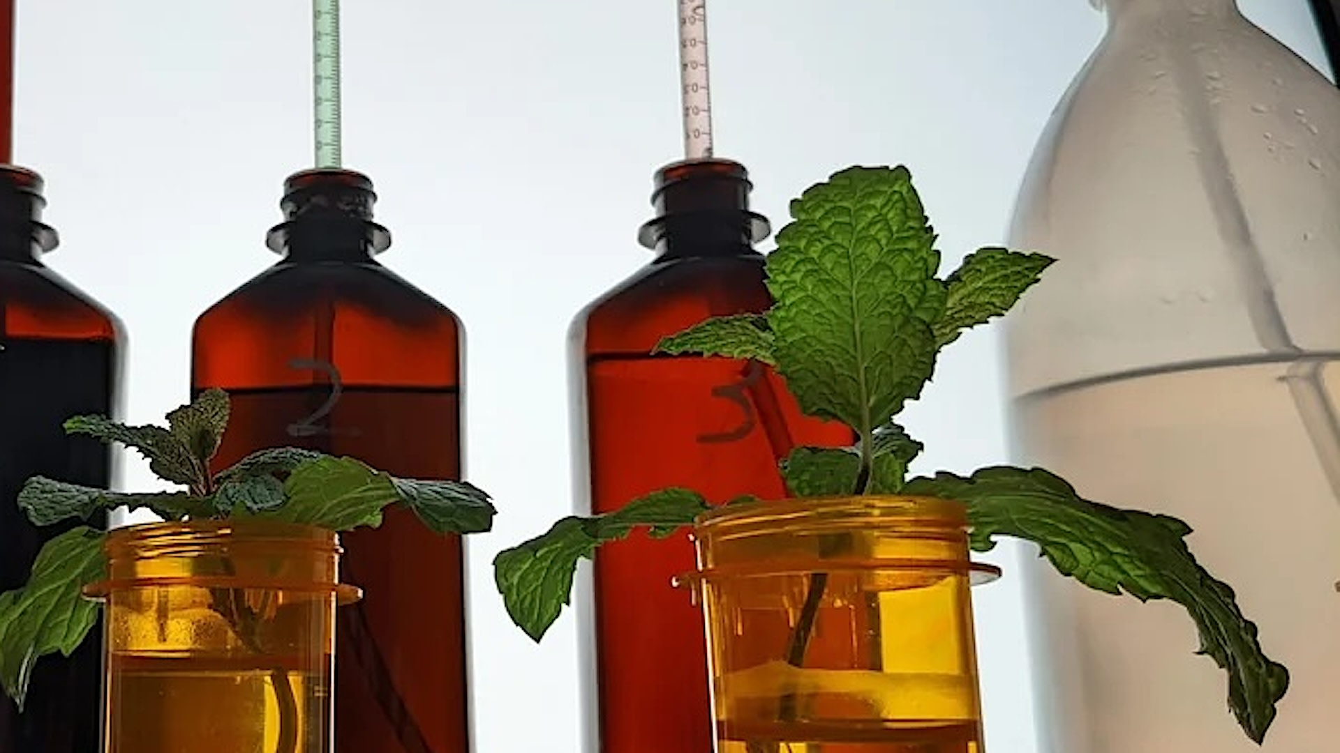 The images show the herbs growing inside pill bottles, with their root systems soaking in the nutrients placed inside. Posed behind them are glass bottles and syringes.