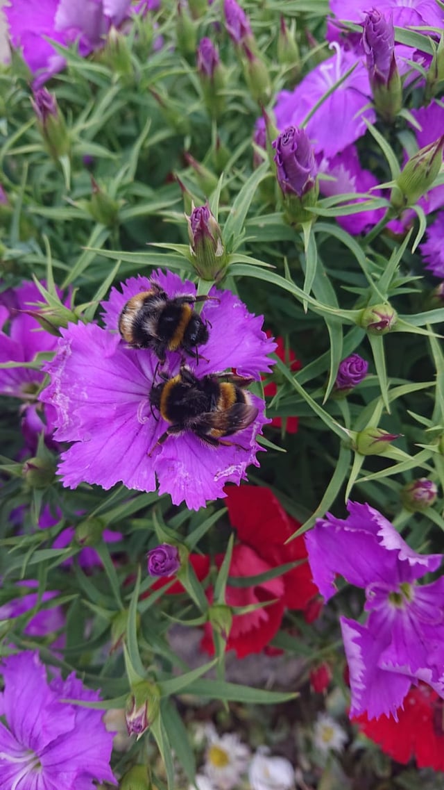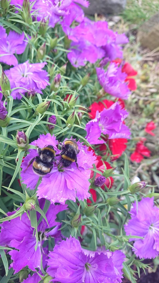 While I was doing some weeding, I noticed a lone bumble bee on the grass, on closer inspection, I noticed it was missing a wing. I gave it some sugar water, and moved on to some flowers, didn't think much more about it until dusk. When I went back to the flowers I noticed, that the bee had found a friend, what was even more strange the other bumble bee had no wings. They where together touching as if seeking comfort, I don't know why, just curious as bee's seem to avoid each other most of the time. It started raining heavily the next day so I took them inside, gave them sugar water then when it cleared up, put them back on the flowers. I did this for three days, then they both were gone.