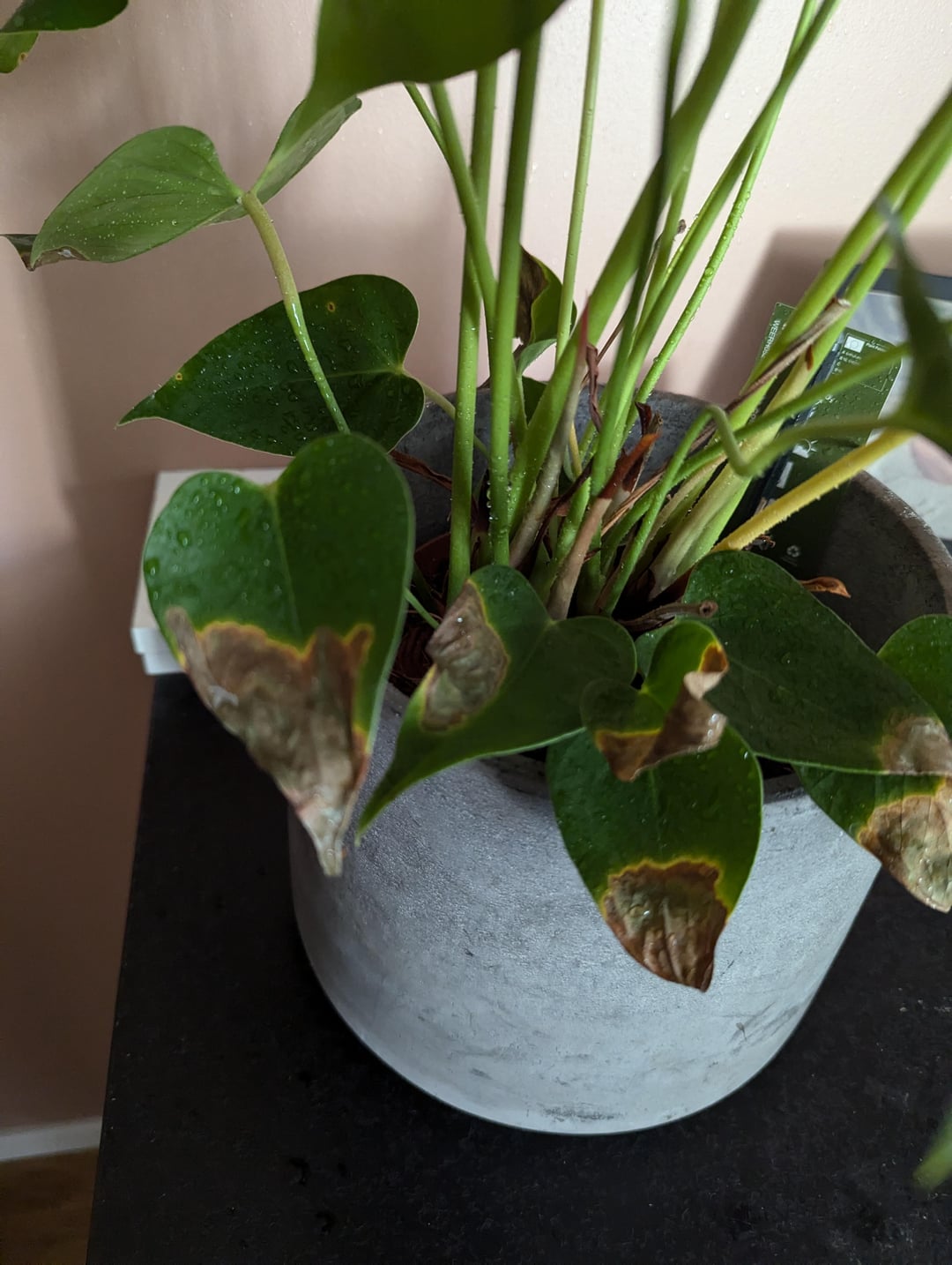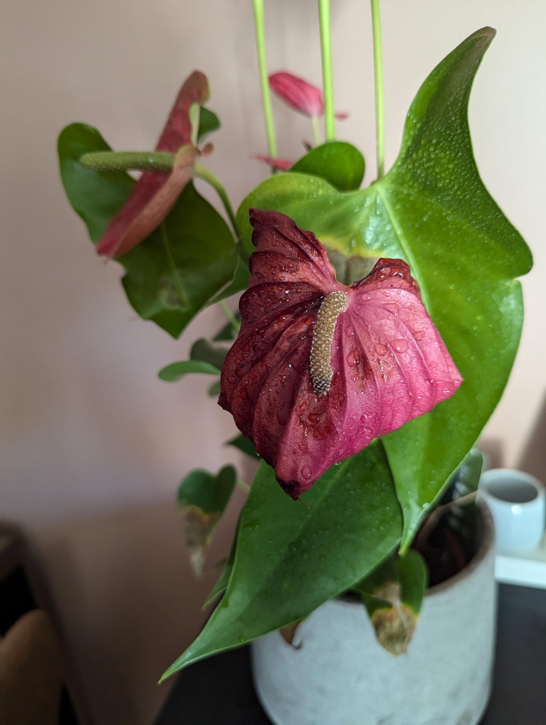 Spraying the leaves is pretty bad, in nature there is wind, so rain is completely fine, but inside, air is mostly stagnant, so by leaving water droplets on leaves, you invite fungal and bacterial infections. A shower or wipedown to clean dusty leaves on occasion is fine, but don’t spray it. If you want to raise humidity around it, get a humidifyer, they add micro moisture to the air, so no dropplets, but anthuriums, especially the type you have can handle dry air so there is no need.