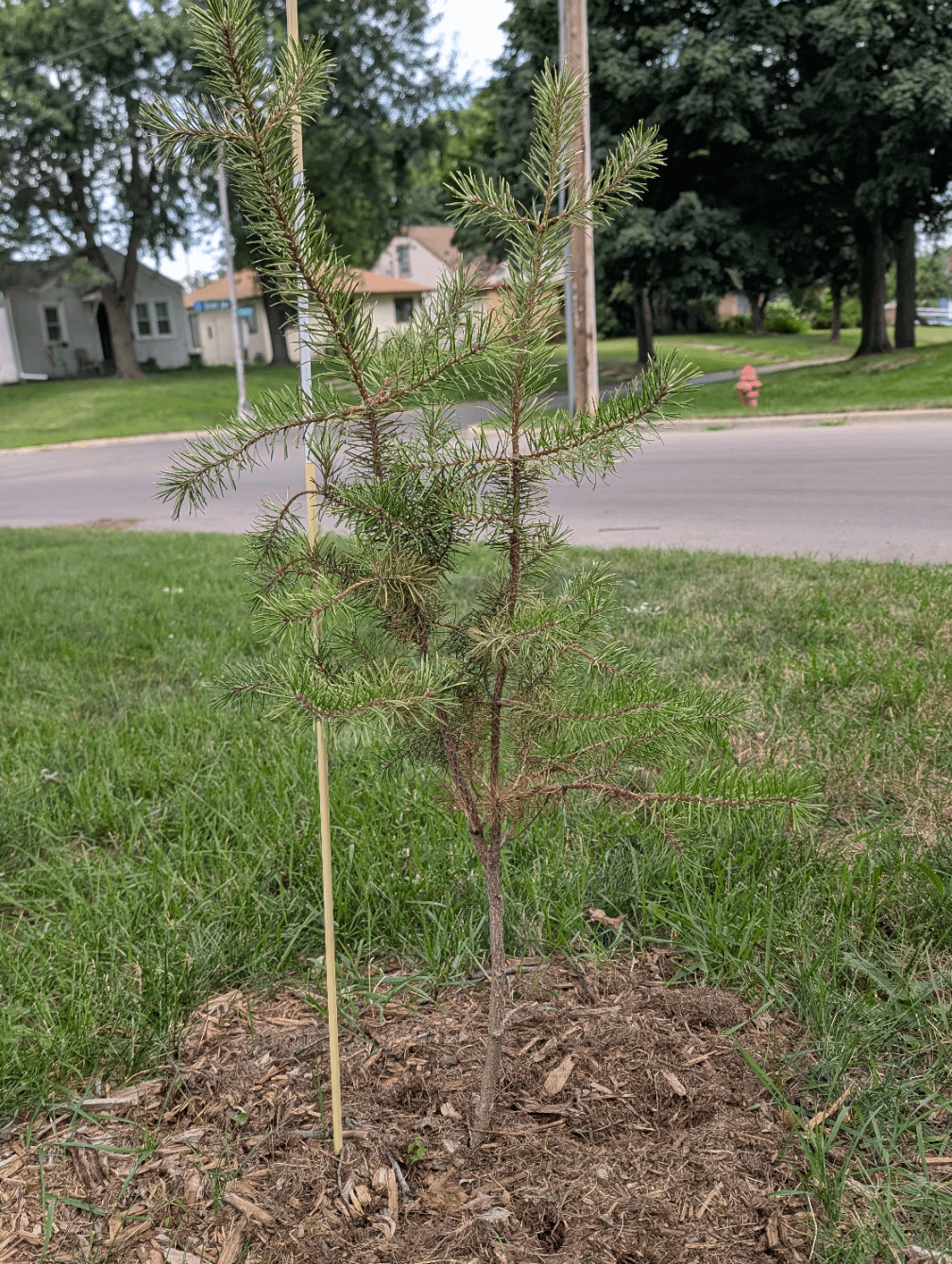 All great advice. i would trim the left as the right branch seems more vertical. If you have deer in your neighborhood I would consider temporary fencing around the pine.