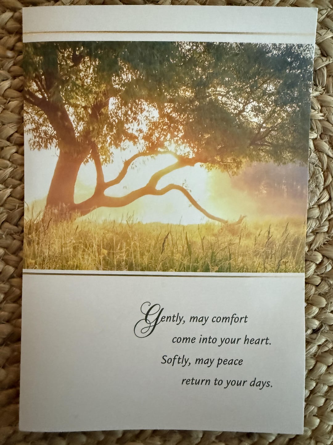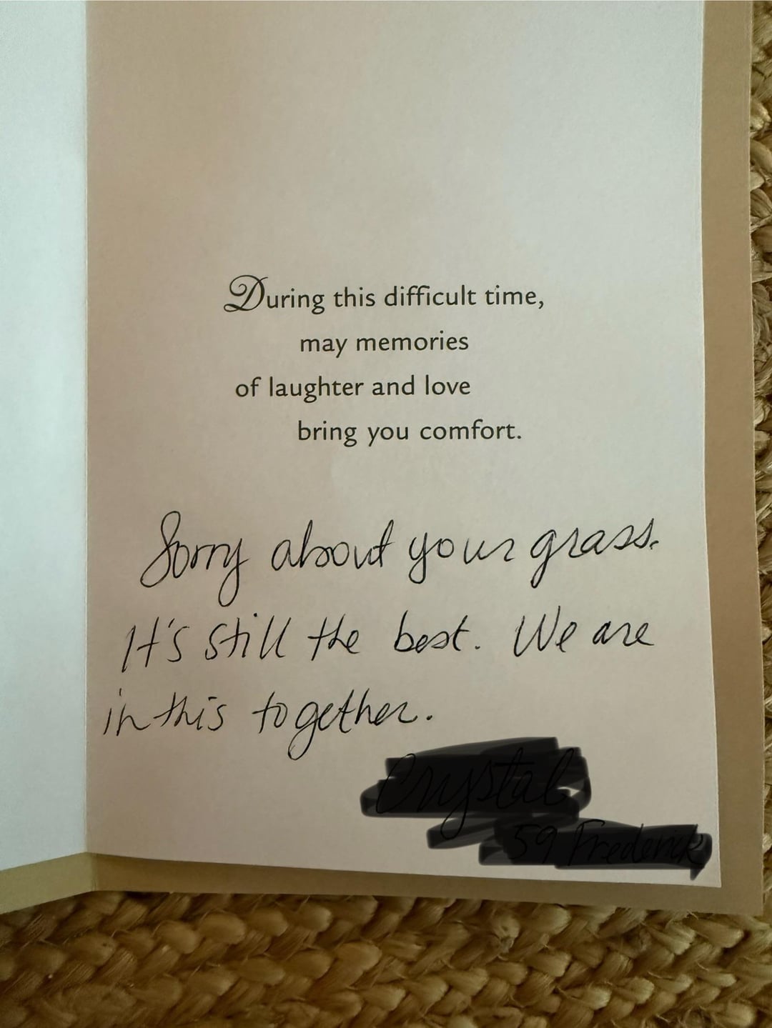 One of the major phone/internet carriers have been digging holes in our lawns to install new lines. My husband had worked so hard on our front lawn and all our neighbors knew it. Today, we received a sympathy card about our dug up lawns.