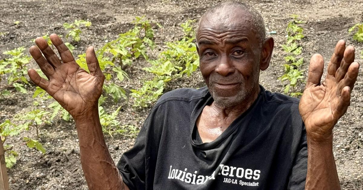 Fred Sipp poses with okra he harvested that morning on the Lafitte Greenway in New Orleans, Friday, Aug. 12, 2022. (Photo by Sophia Germer, NOLA.com, The Times-Picayune | The New Orleans Advocate)