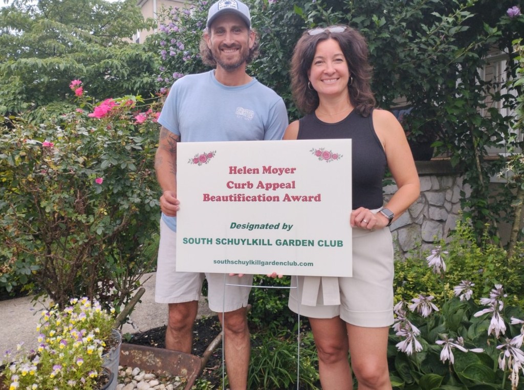 Ryan and Sara Wehr of Schuylkill Haven are the recipients of the 2025 Helen Moyer Curb Appeal Beautification Award presented by the South Schuylkill Garden Club. The award is handed out annually to families that add beauty to their community. The Wehrs said that friends and neighbors provided plants and the old wheelbarrow that is a centerpiece to the gardens. The gardens can be found on Ave C. in Schuylkill Haven.