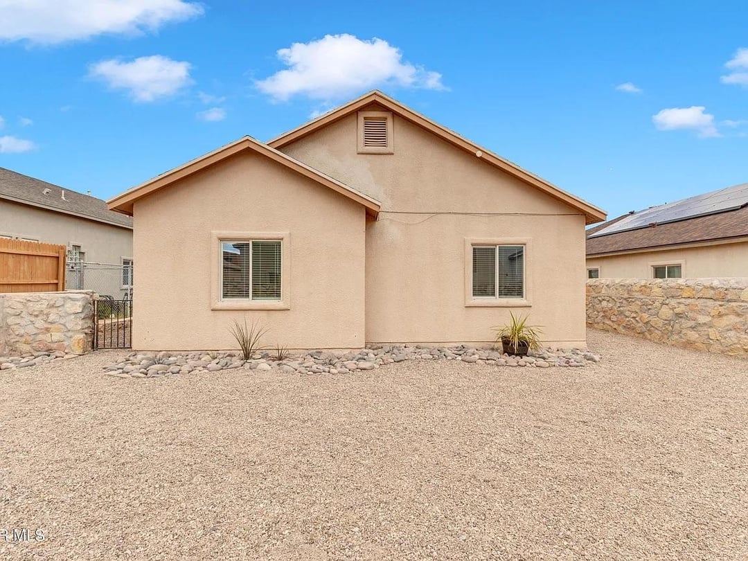 Replace the rock with native plants. Whatever grows in your area will probably be fine. If it’s tends to be more water logged take that into account but given it’s a desert climate, you’re more than likely fine. If you have to, keep the turn but I’d even recommend replacing that with a native ground cover or grass too. Those will ultimately make the back yard feel better/more usable. And if you HAVE to have turf, take a look at clover. Though I have little experience with clover in desert climates.