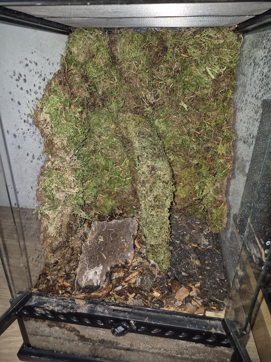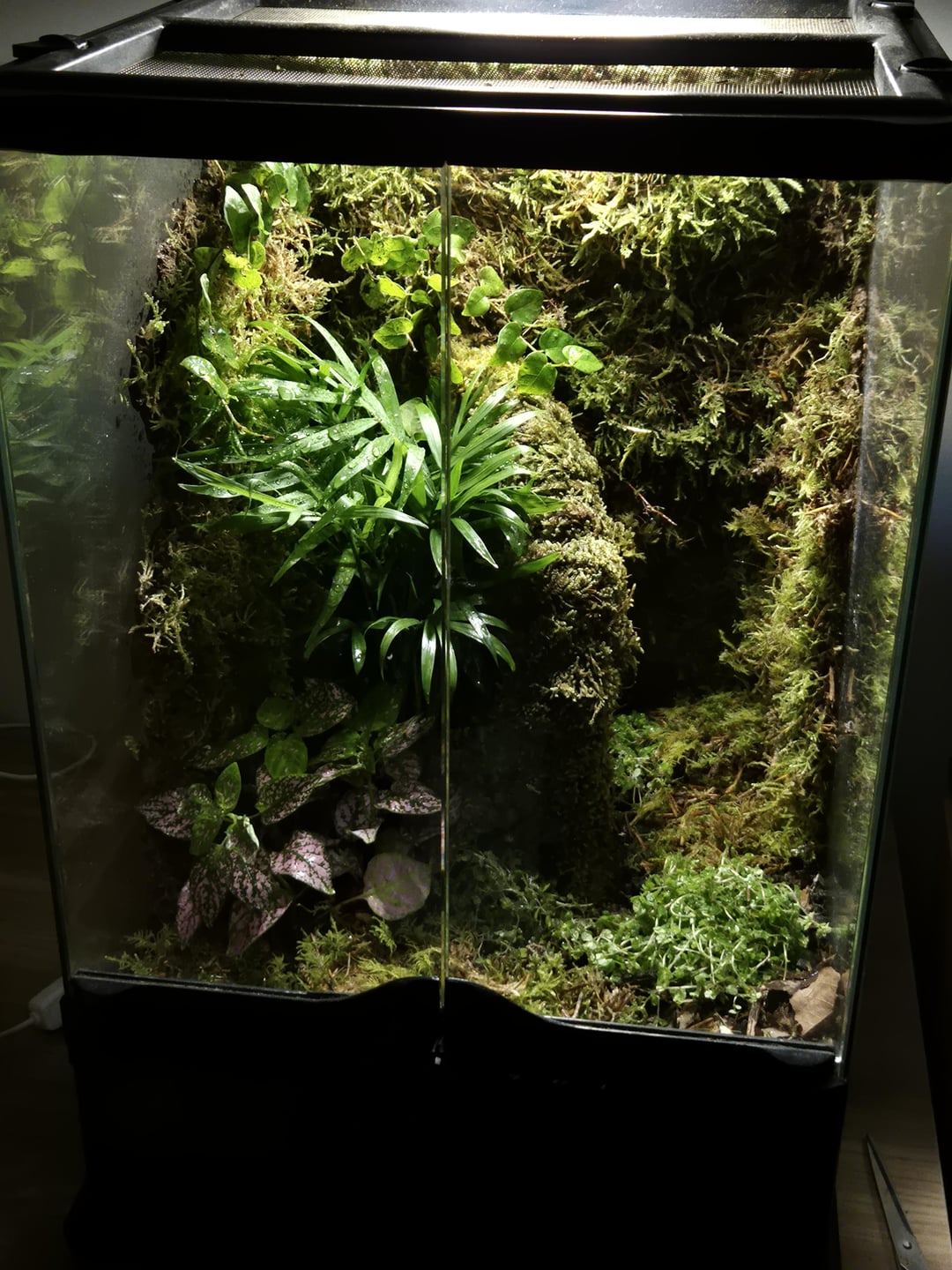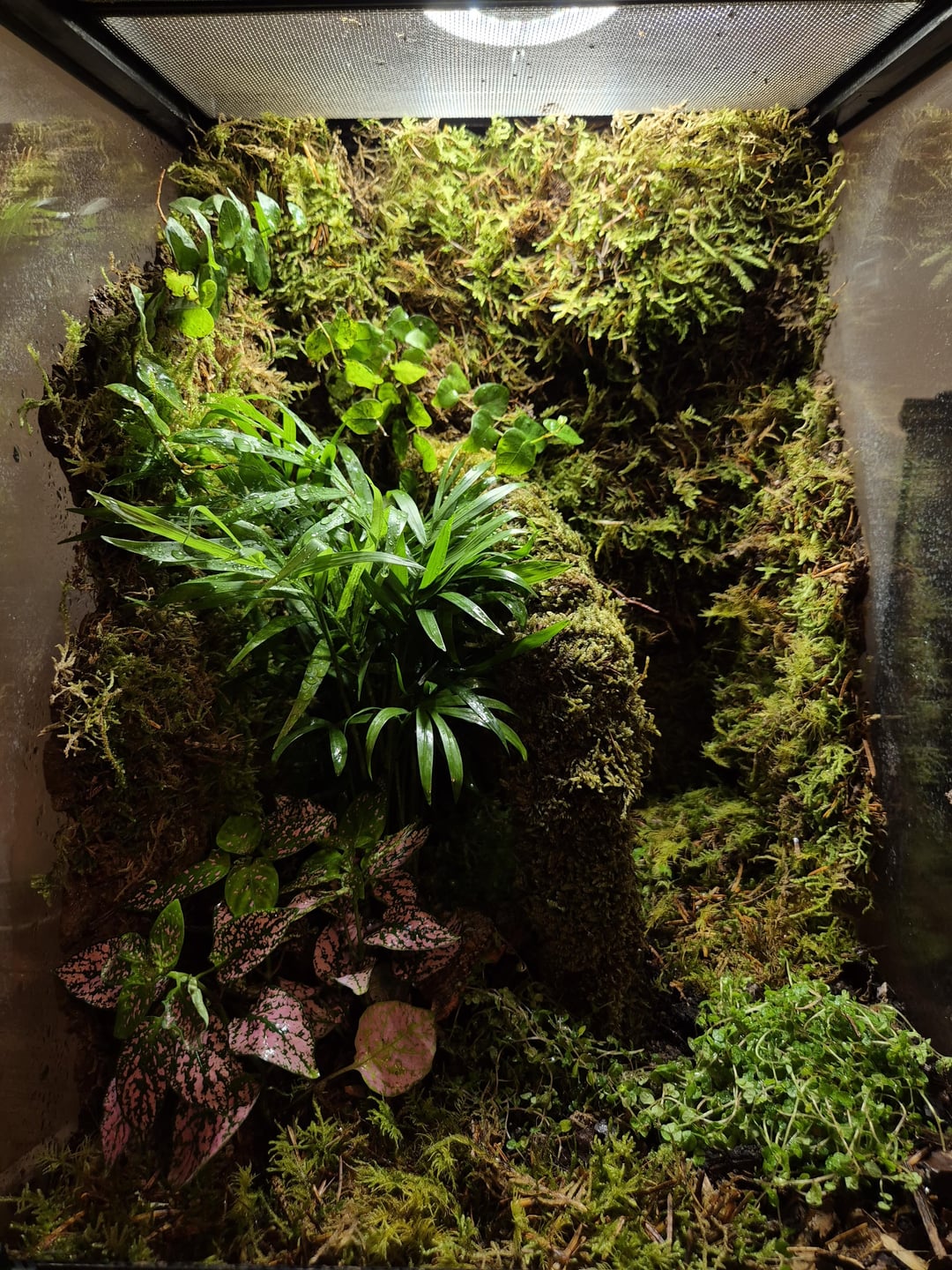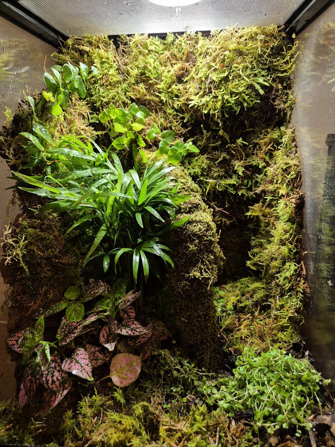 Hi guys, this is my first go at doing a moss wall vivarium! All there is in there now is isopods (dairy cows and tropical orange). Very spoilt ones as well! 🤣 I had all these plants in my pacman frog vivarium. Parlour palm was too tall, and I moved the fittonia just because. He's got pothos and baby tears now.