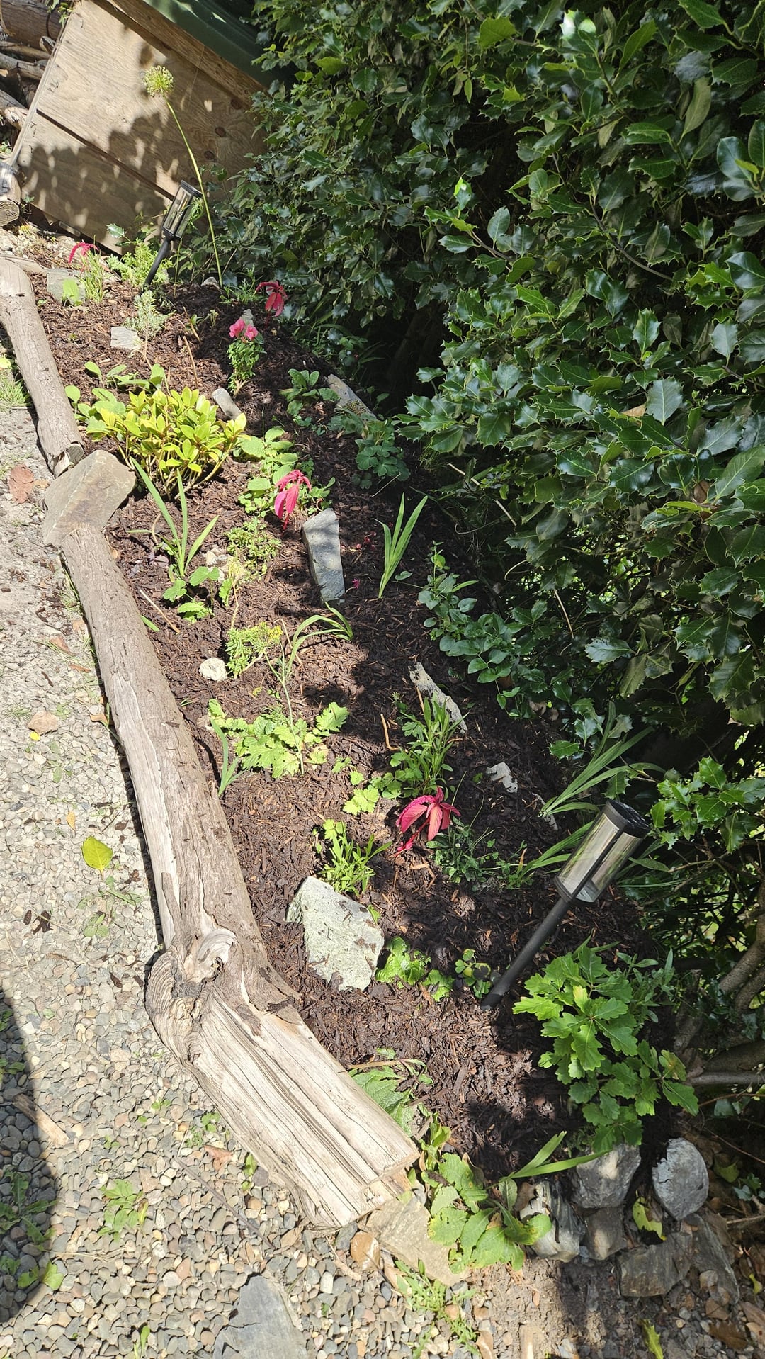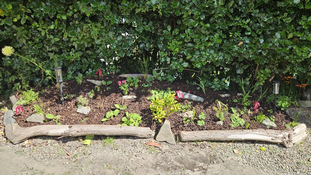 But I think this looks much better – removed the unwanteds, added some plants I had lying around, a little bush for structure, a layer of compost and then bark and some rocks 👌