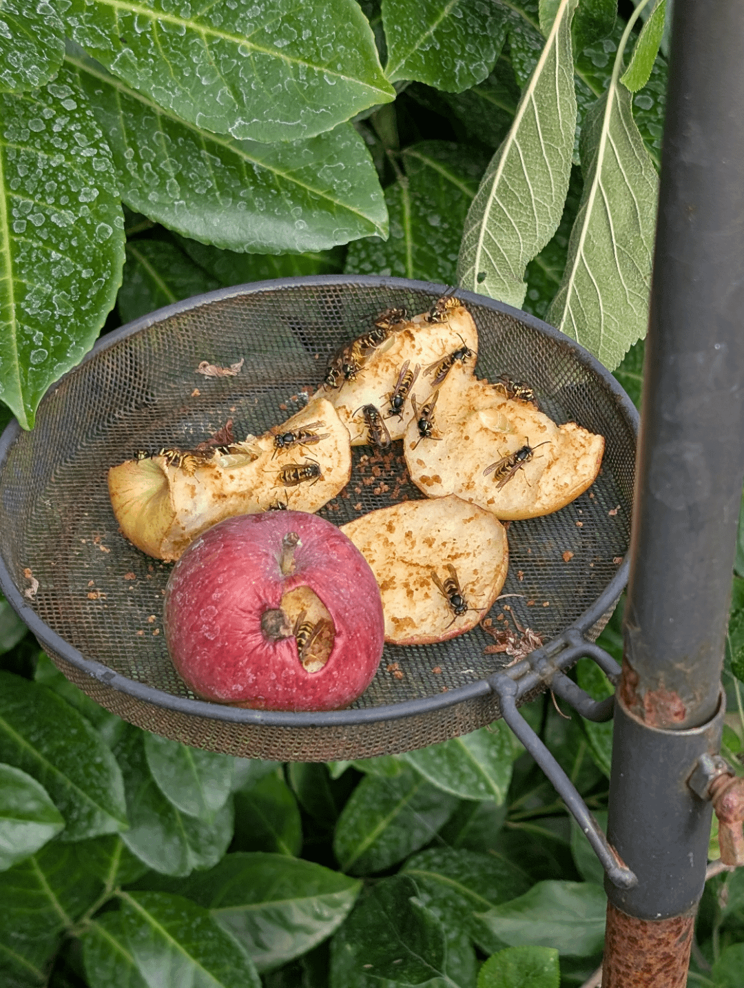 Adult wasps can only feed on sugar, so put some apples out for them. In late summer they get less access to sugar from the hive so rely on access to fruit.