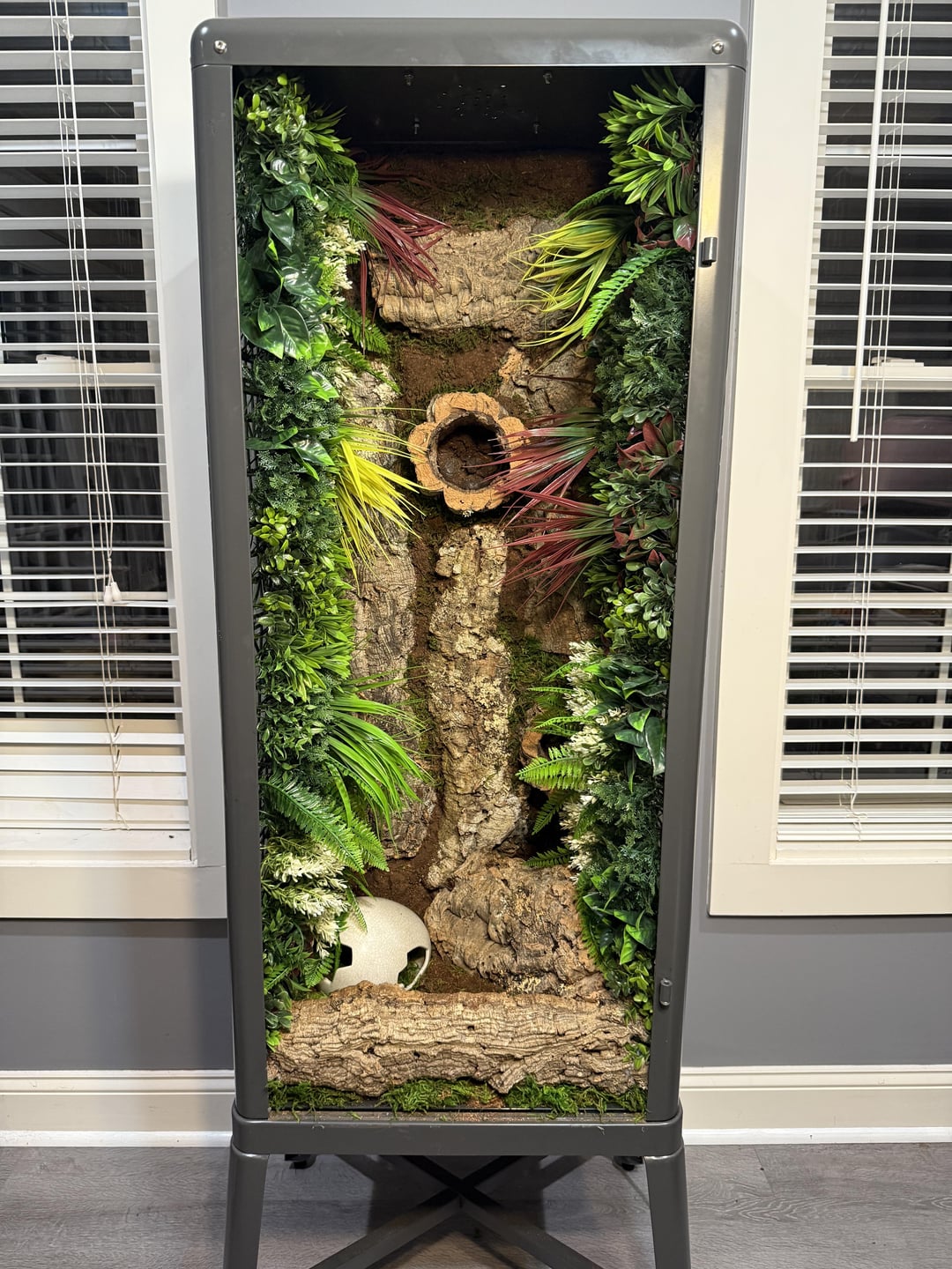 The back wall is built with textured silicone and foam, cork rounds / flats featuring moss to provide plenty of climbing space and the sides are fully decked out in faux greenery for that lush, overgrown jungle feel.