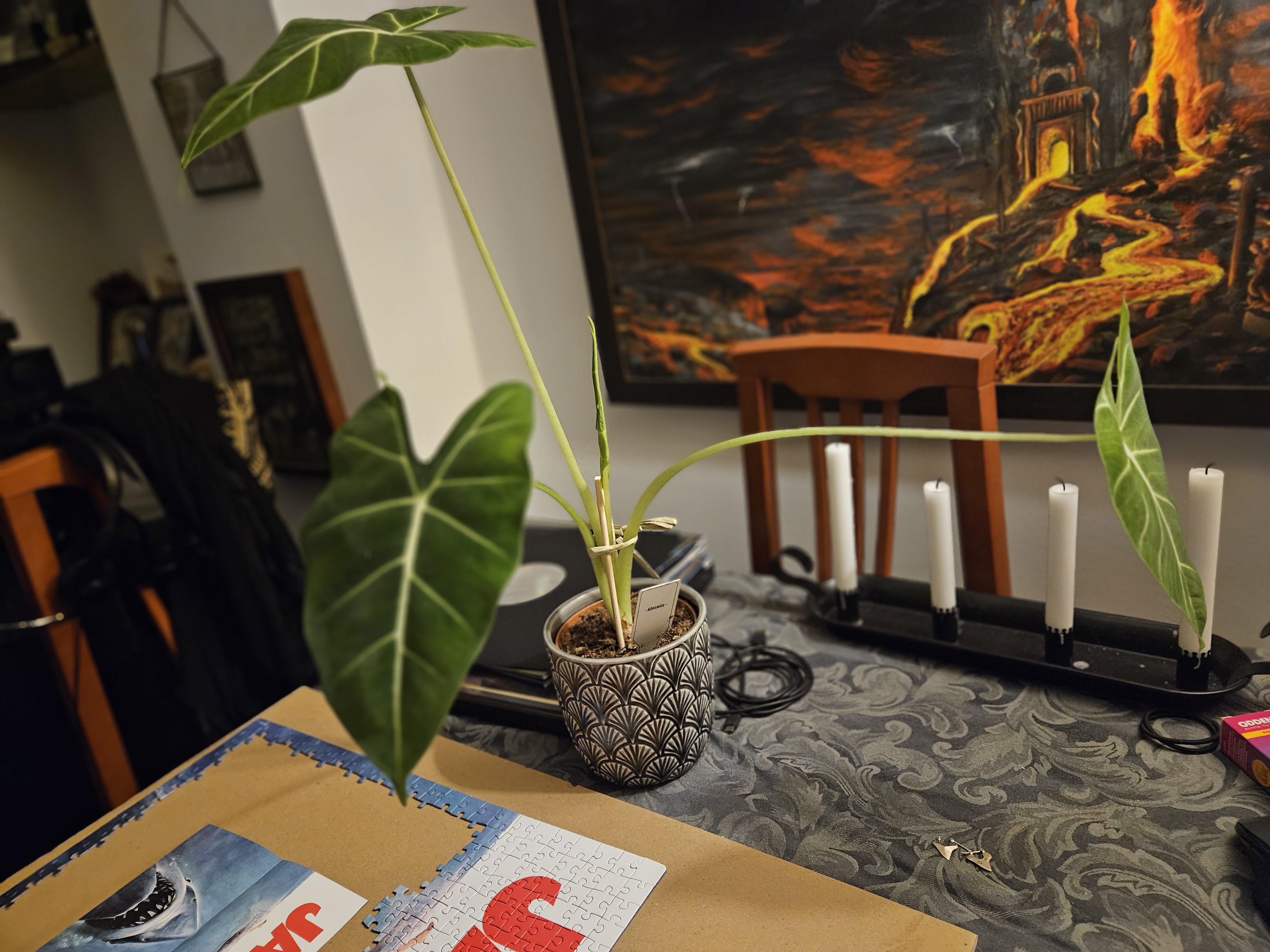 My friend gifted me this Alocasia. It was pretty short when she first gave it to me. I kept it at her house for a couple of weeks and went I went to pick it up, it had gotten SO tall. I think she might have kept it in the gift bag for a while so the stems grew tall to reach out of the bag. The two tallest stems are around 44cm(17 in). It has grown 2 new leaves (including that little guy growing in the middle!) since I brought it home, but I've also had to cut off a leaf that was yellow and droopy, and might have to cut off the one on the right as it appears it might wind up with the same yellow and droopy fate. I water it once and week and move it to the coffee table in indirect sunlight during the day. The stems were already tied together to keep the stems upright, but I've added two chopsticks. As it keeps growing, Im not sure how to keep them held up. Is it just a plant that is doomed to only have 3 long ass stems at a time? It was hard getting the plant in one photo, but I can upload more if that's helpful! Thanks in advance!