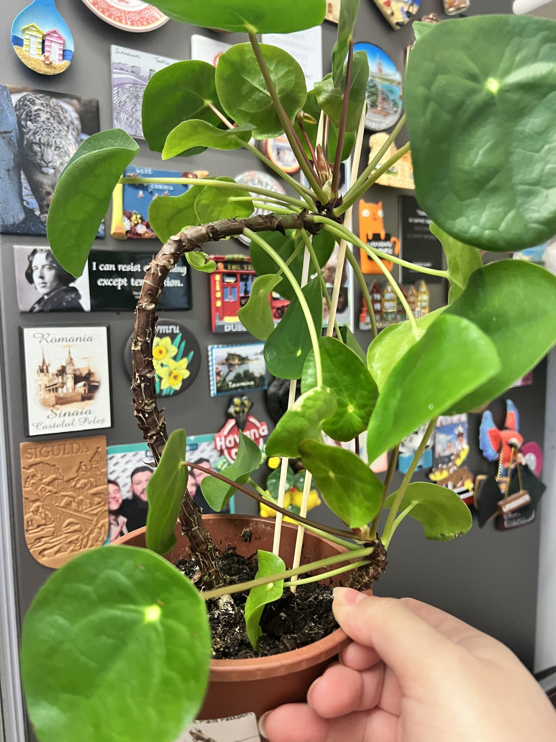 My mother in law gave me this Chinese money plant this weekend. I bought the right soil, different pots to separate the 2 plants, and I would like to repot them, however I’m not sure how to approach the bigger plant. I’m worried it will snap once it gets bigger and heavier? I temporarily stuck two skewers in the soil to support it until I repot it. She watered it just before rehoming it, so I haven’t done that yet.