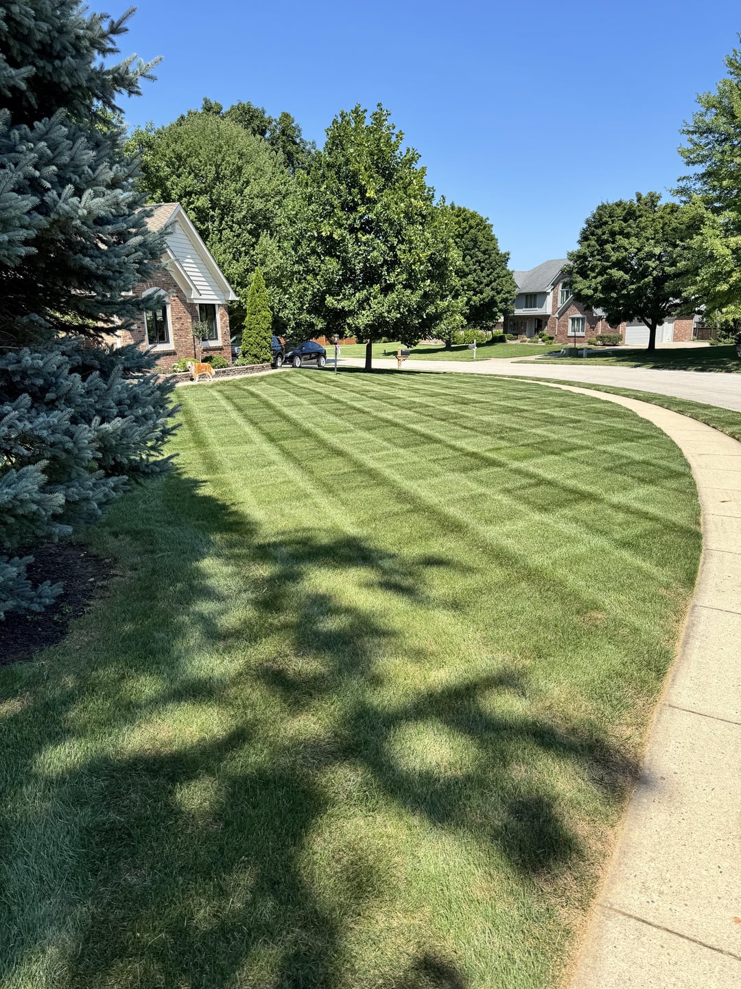 Your lawn looks fine for Indiana in August. You can use seakelp/humic in the summer to boost roots, I’ve even seen success in applying low amounts of N/Fe to maintain that green look.